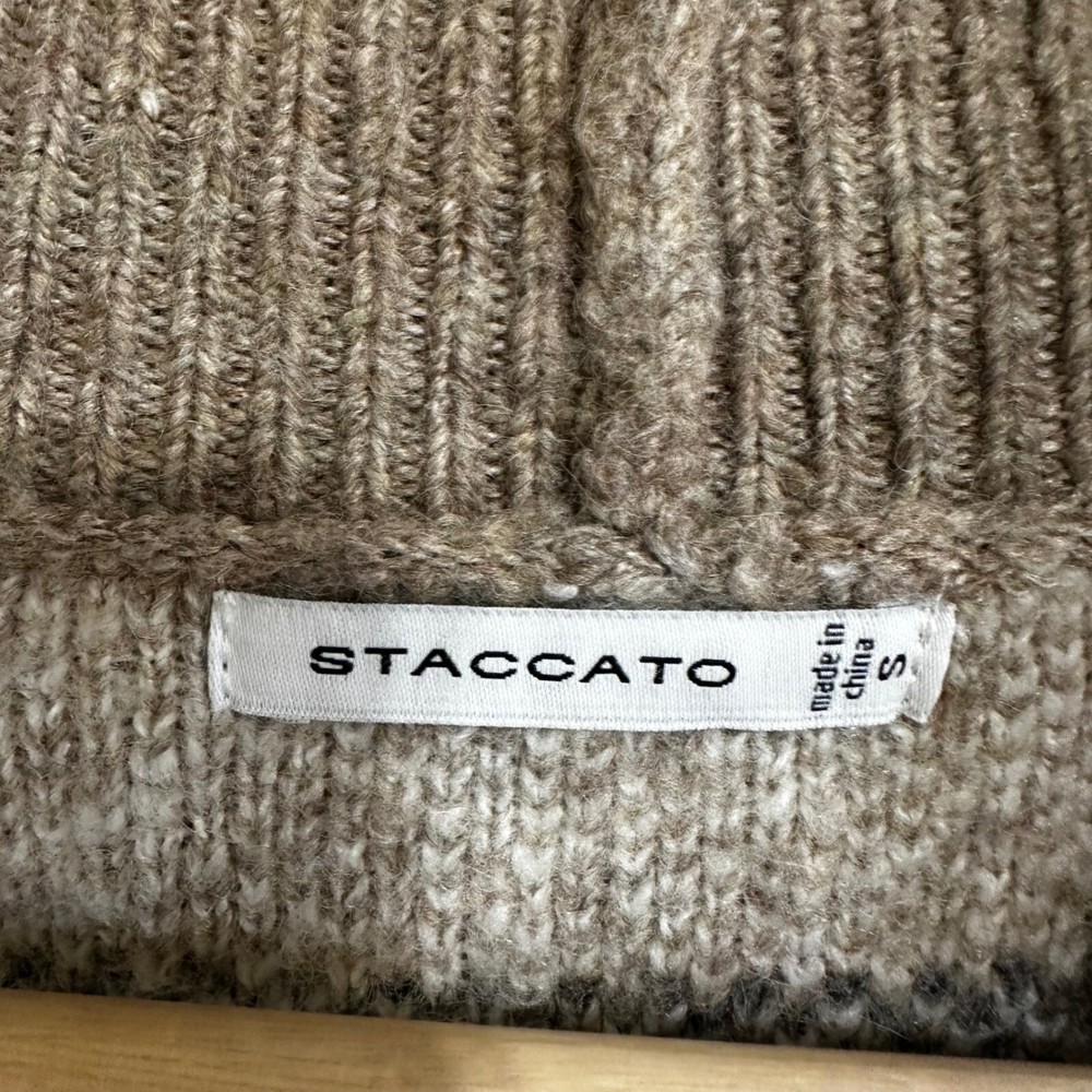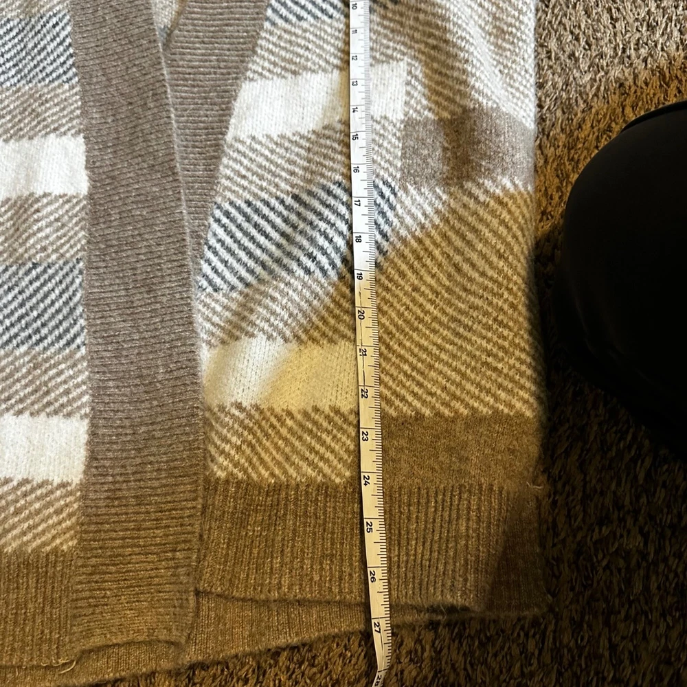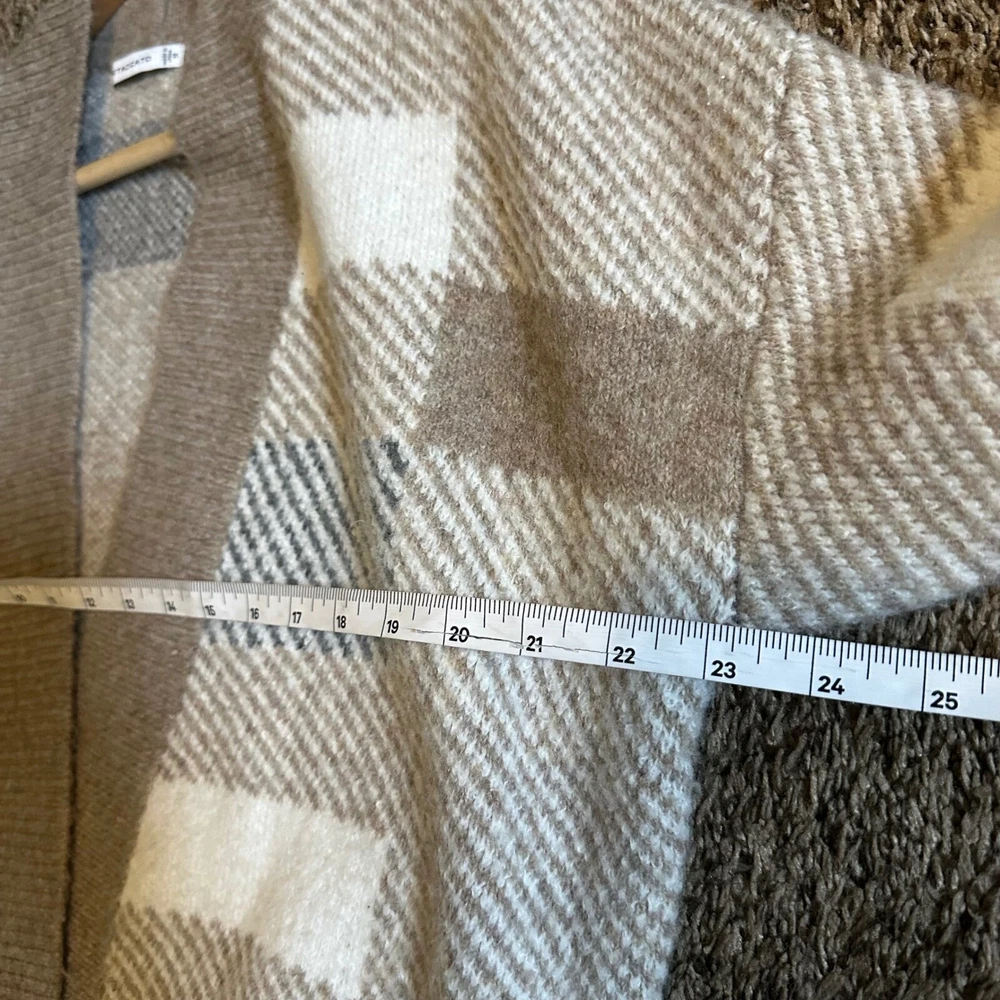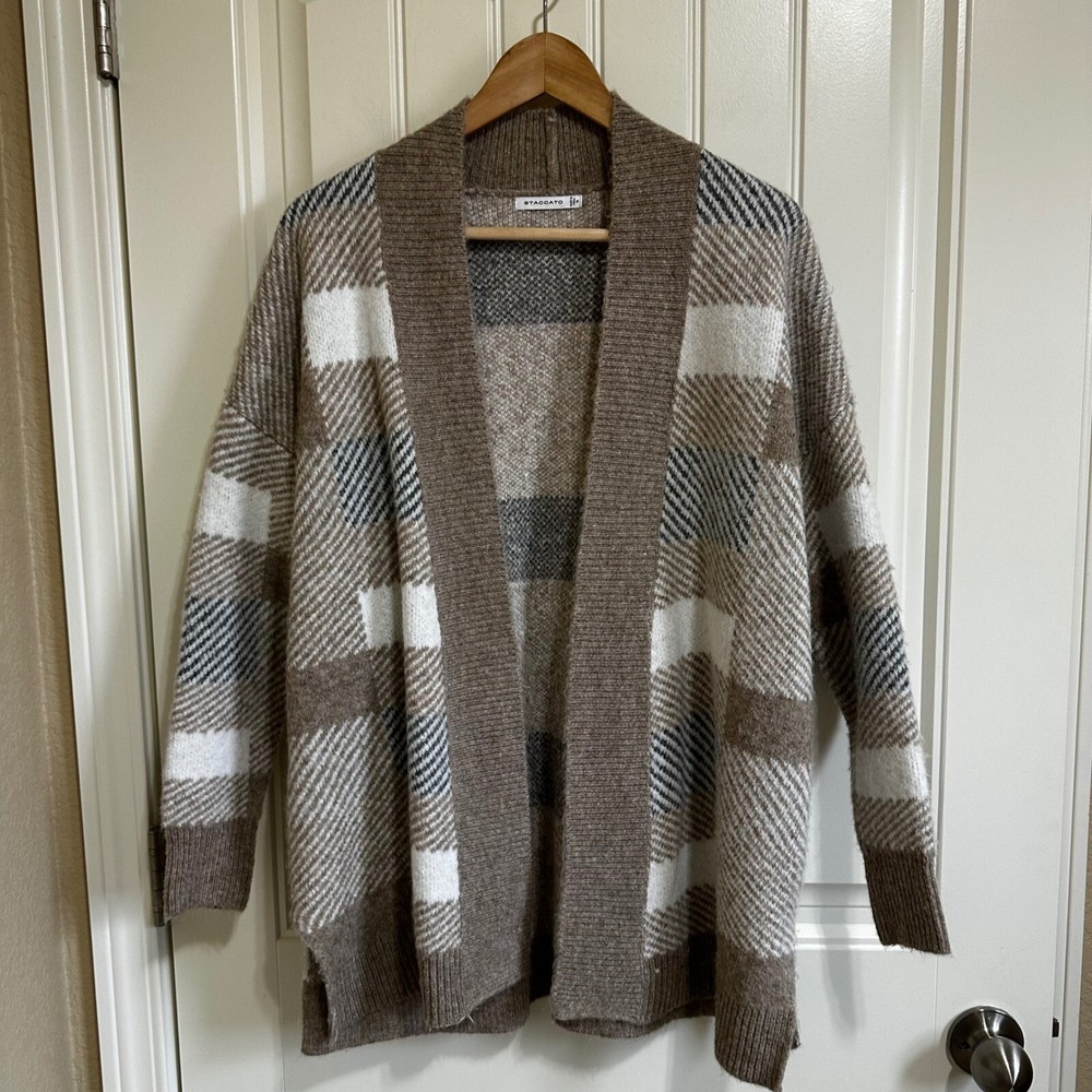 Envelop yourself in the rustic charm of this Staccato plaid cardigan, a cozy statement piece that blends comfort with effortless style. The open-front design drapes beautifully, creating a relaxed silhouette perfect for layering. Its soft knit construction promises warmth and a gentle touch against the skin, while the earthy brown tones, accented with cream and subtle hints of black, evoke a sense of natural elegance. This cardigan features a duster length, adding a touch of drama and sophistication to any outfit. Ideal for brisk autumn walks, cozy evenings by the fireplace, or adding a stylish layer to your everyday ensemble. Style: Cardigan Color: Brown Department: Women Type: Sweater Material: Acrylic, Polyester, Nylon, Spandex, Acrylic Blend Sleeve Length: Long Sleeve Neckline: Round Neck Features: Open Front, Knit, Duster Length, Cozy, Oversized Pattern: Plaid Sleeve Type: Dolman Sleeve Fabric Type: Knit Keywords: plaid cardigan, open front sweater, knit duster, brown cardigan, cream plaid, staccato cardigan, womens sweater, fall fashion, cozy sweater, plaid knitwear, boho cardigan, casual cardigan, plaid sweater, duster cardigan