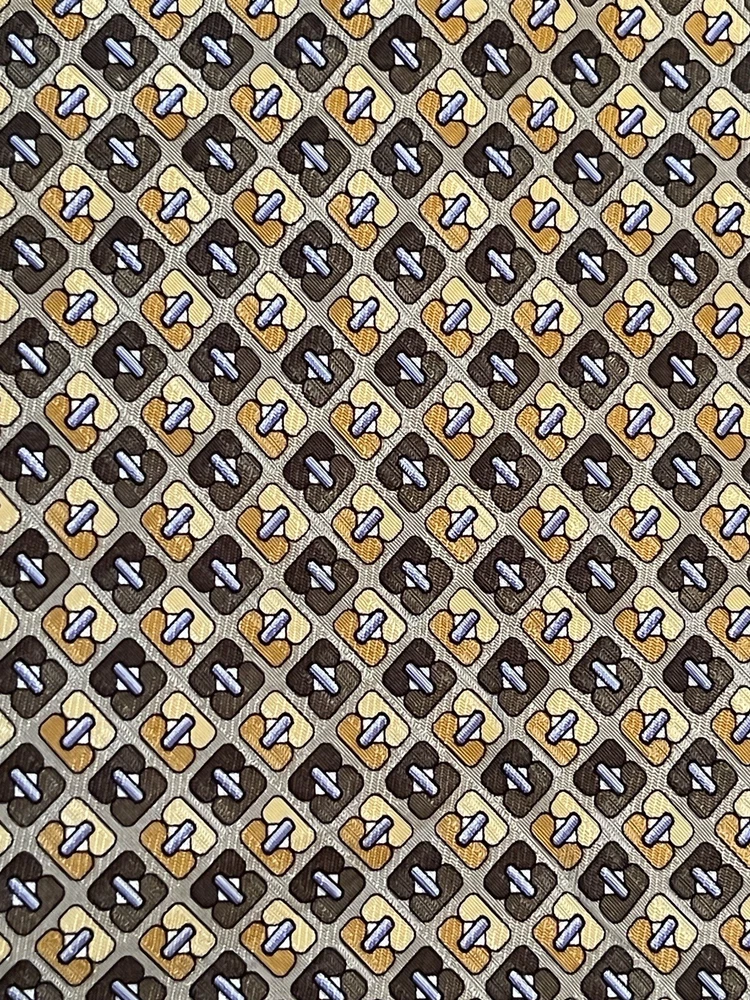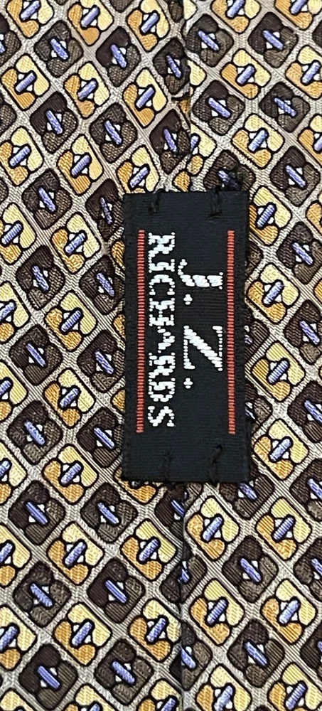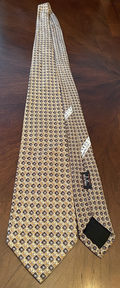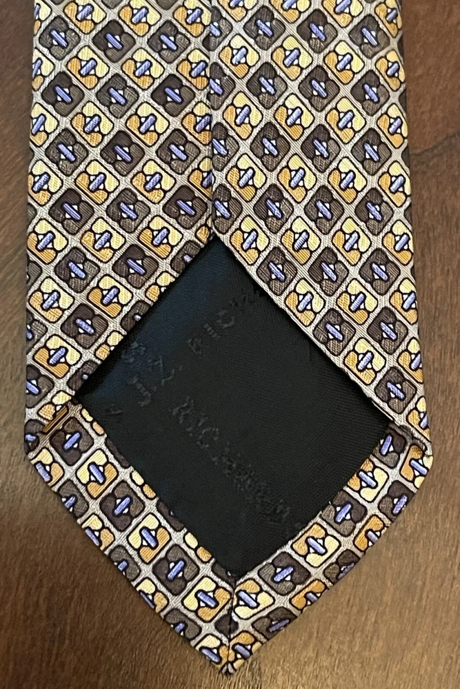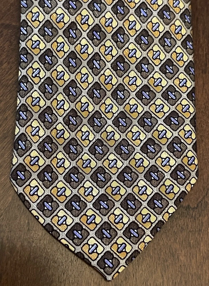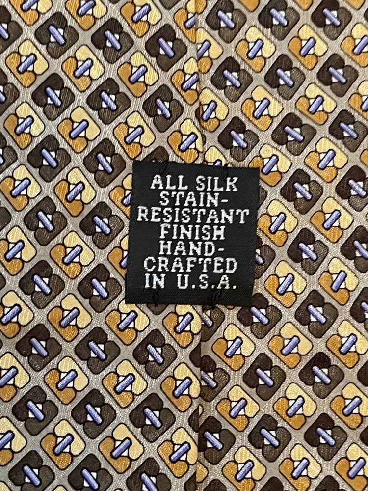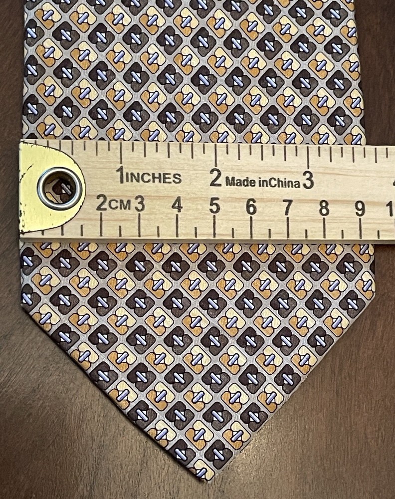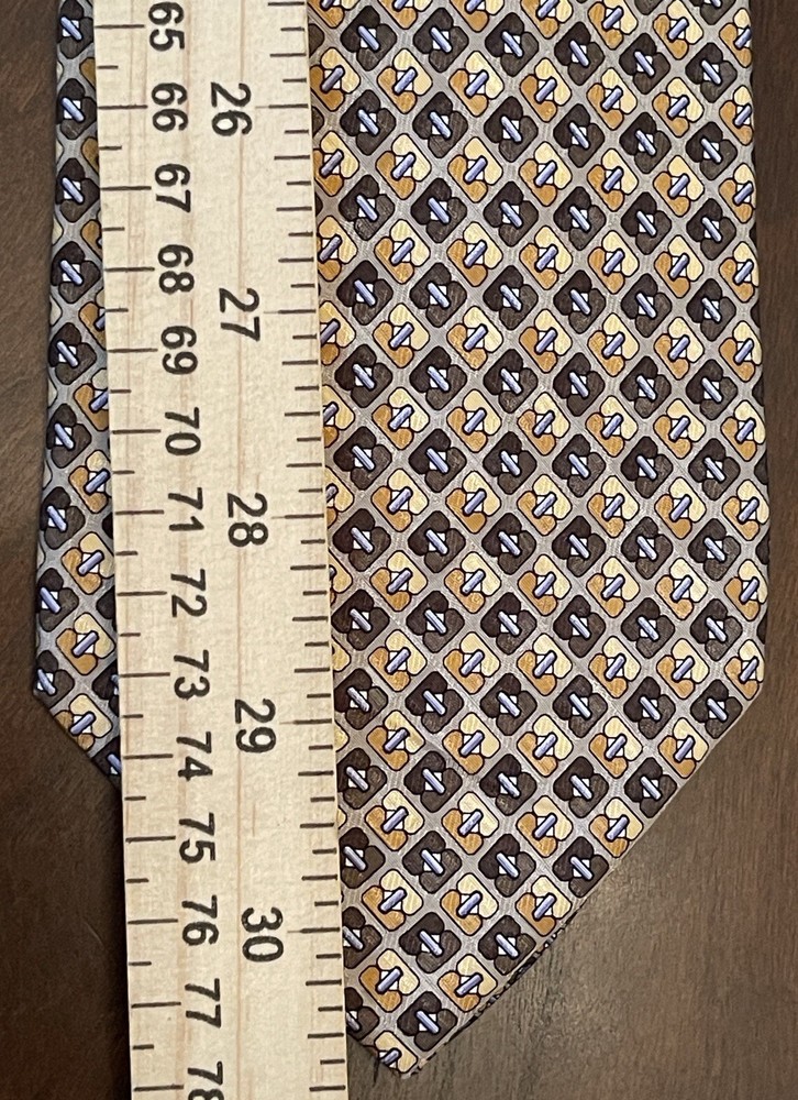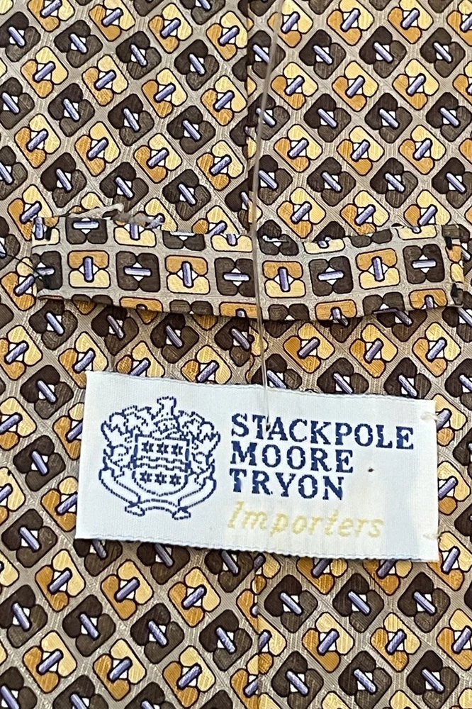Elevate your style with this designer silk tie from Stackpole Moore Tryon. This long tie, made in the USA, features a captivating geometric pattern in multicolor, perfect for adding a touch of sophistication to any outfit. With a classic width and adjustable features, this handmade tie is a must-have for any fashion-conscious man. Whether you're dressing up for a special occasion or simply want to add a statement piece to your everyday look, this tie is the perfect choice. The travel and abstract theme of the pattern adds an element of adventure and creativity, while the high-quality silk material ensures a luxurious feel. Don't miss out on the opportunity to own this one-of-a-kind tie from a trusted brand like Stackpole Moore Tryon. Please check measurements No holes or stains All ties come sealed in poly mailer inside crush proof box ties under $10.00 do not come with box