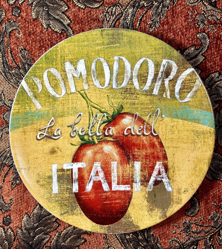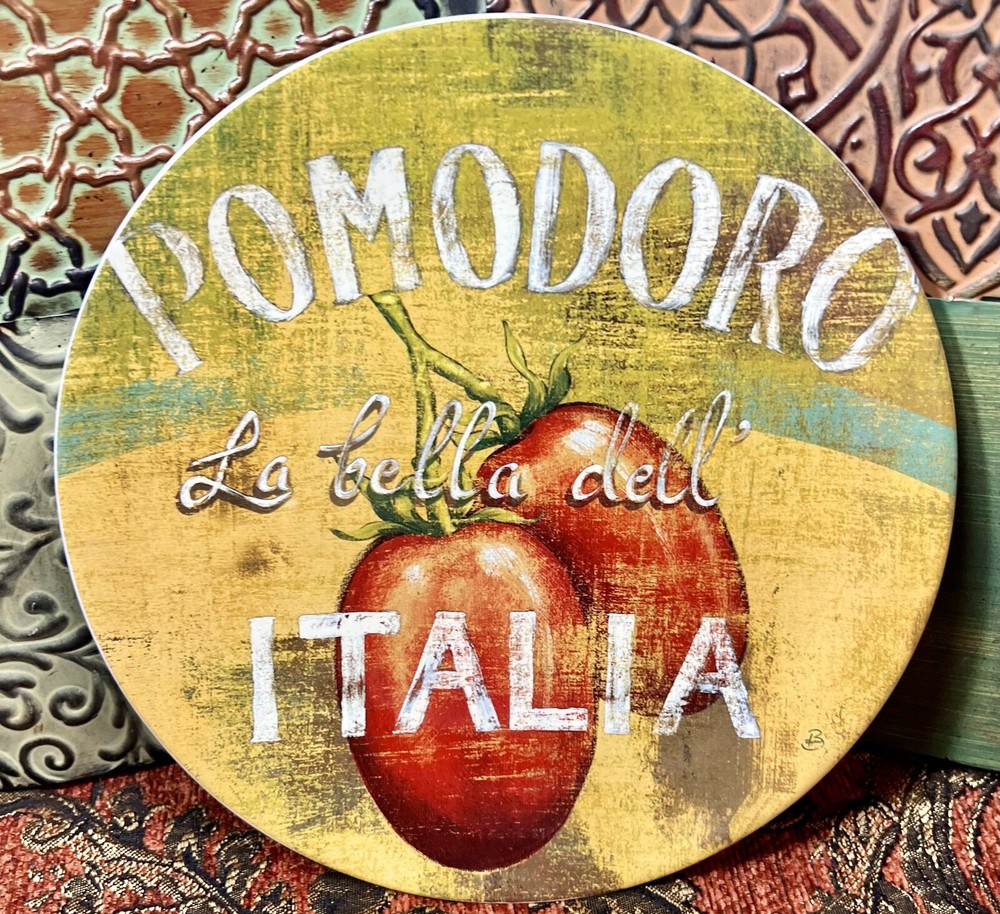 Add a touch of Italian charm to your table setting with this beautiful Pier 1 Imports bread plate. The round plate measures 8.25 inches in diameter and features vibrant red tomatoes on a yellow and green background. With “POMODORO La Bella dell ITALIA” written in white. Made of durable stoneware, this vintage plate is perfect for all occasions and is stackable for easy storage. This plate is microwave and dishwasher safe. The glossy finish and decorative design make it a great conversation starter. Made in China in the 1990s, this plate bears a printed backstamp and is a must-have for any collector. These are new but do not have the tags. No chips, scratches or cracks. D104 S