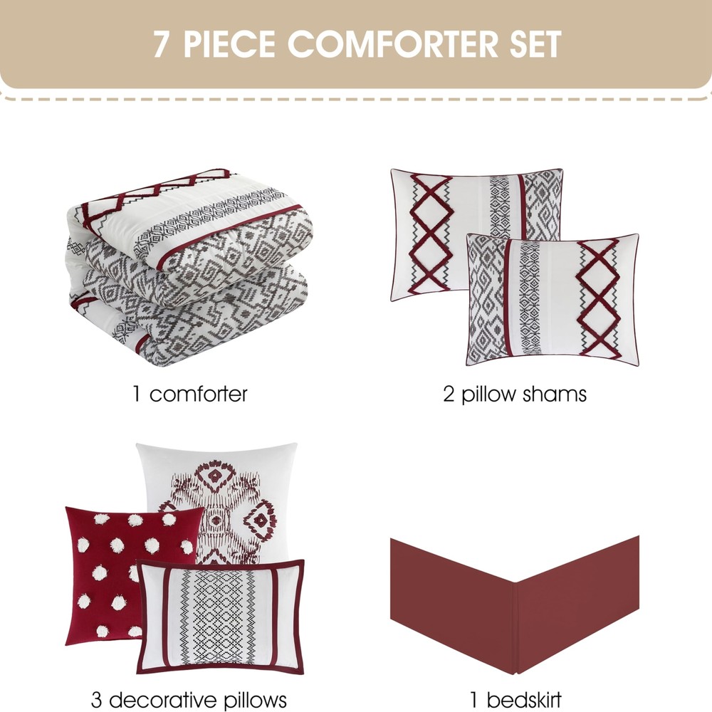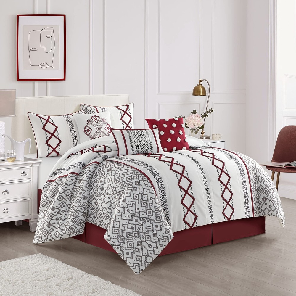 Item Name: Stratford Park Luxury 7 Piece Cozy Comforter Set, King Size, White and Red, Embroidered Bedding Sets, Premium Microfiber, All Season Home Decor Description: Surround yourself in an exotic garden with the Orion Comforter Set. Vibrant colors create intricate over scaled floral medallions that are bordered by luscious vines while the delicately metallic shimmer add a rich textural dimension. [Exquisite and Exclusive Design] Soft color print combined with very dimensional terry embroidery give this set very luxury look .Our fashion forward comforter sets blend style and function to give you the best looking and most comfortable bedding. | [Supreme Softness] Immerse yourself in the unparalleled softness of premium polyester, designed for a luxurious sleep experience.Crafted with durability in mind, ensuring long-lasting comfort for years to come. | [What You Can Get] 1 Comforter- 104 inches x 92 inches,1 Bedskirt 78 inches x 80 inches + 15 inch drop,2 Pillow Shams - 36 inches x 20 inches,3 Decorative Pillows -1-18 inches x18 inches 1-16 inches x 16 inches, 1-12 inches x 18 inches | [Easy Care]Machine wash cold,gently and separately.Do not bleach. Tumble dry low.Remove promptly.Do not iron. | [Great Gift] A thoughtful and practical present that adds a touch of elegance to any bedroom.Perfect for friends or family moving into a new home.Help them create a warm and inviting space with this stylish quilt set. Quantity: 7 ------------------------------------------------------------------------------------------------------------------------------------------------------------------------------- Diamond Home strives to provide excellent customer service, fast delivery, and high quality products. Should a problem occur with your order, please contact us right away through eBay π βοΈ Guaranteed 30 Days to Return once delivered! βοΈ We offer FREE SHIPPING on all orders! π βοΈ All items ship from the USA. βοΈ Receive a tracking number within 1-3 business days! βοΈ Receive your order 3-5 business days once shipped out! β Most orders are shipped via FedEx, UPS, or USPS. β We accept Credit Card or Paypal! β We do not accept PO Boxes, please provide a physical address. β We do not accept Freight Forwarding addresses. β We only ship to the lower 48 states. π¦ Hassle-free Returns, simply message our store to get a prepaid return label. β We cover the return cost only if you received a damaged item, wrong item sent by us, or missing parts. β For all other reasons such as no longer needed, the label costs would deduct from your refund. β Important: do not send back without getting a label through us first. β Once in transit back to our warehouse, you will receive your refund immediately, no waiting to deliver back! π ATTENTION BRAND OWNERS [PLEASE READ] βΊ Unauthorized item listed on our store? Copyright, Trademark, or Patent infringement found? β Simply, provide us the eBay Item or Brand Name, and our team will delete it within hours βοΈ GUARANTEED. QUICK. β Please DIRECTLY MESSAGE our store through eBay and we will reply right away that SAME DAY to remove. β We apologize for any listing error made by our staff or coding error and understand how important it is to protect your brand. β We respect your brand's integrity and we will REMOVE any allegedly infringing products from our catalog quickly.