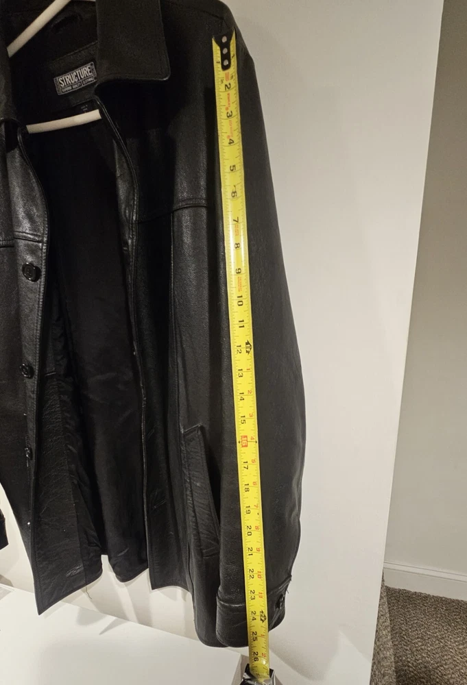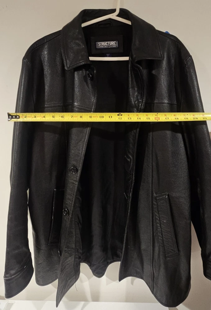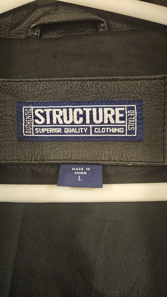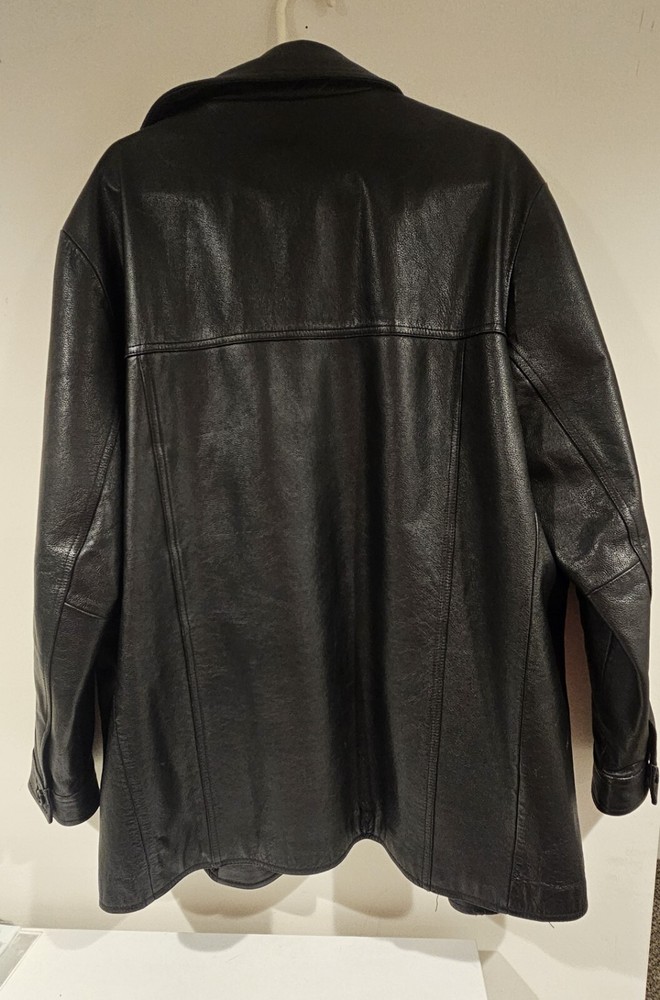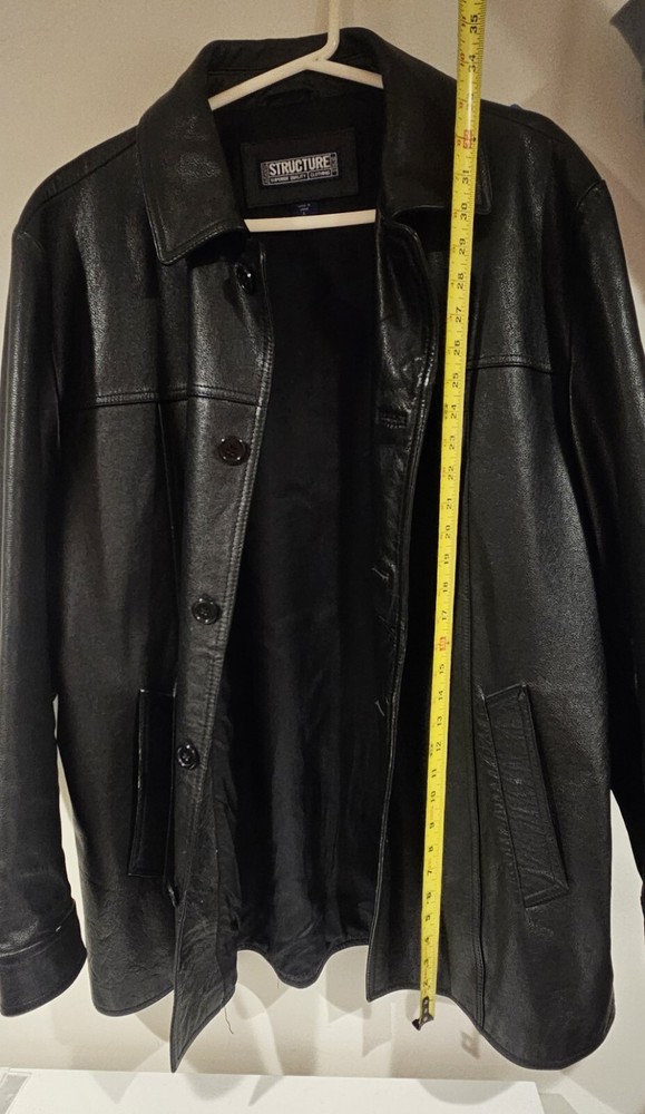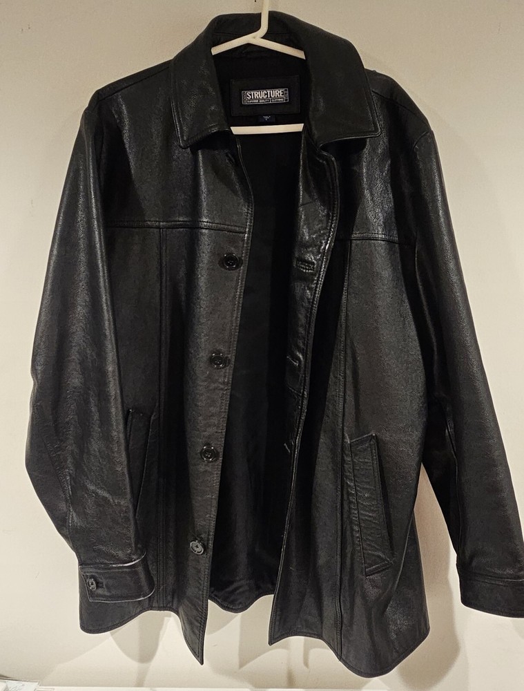This is a vintage black heavy leather coat for men in size L from the brand Structure. It features a solid pattern, button closure, and three pockets. The coat has a classic overcoat style with a pointed collar and is lined with polyester. It is suitable for travel, workwear, or business occasions, and is water and wind-resistant, making it ideal for all seasons. Please review all pictures before bidding as their are signs of wear throughout the jacket consistent with age.