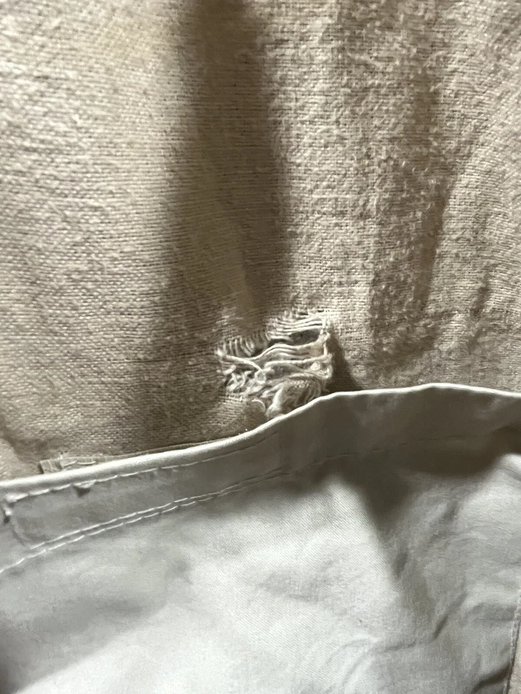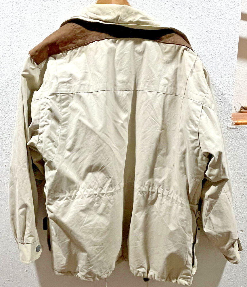Vintage Structure Anorak Mid-LengthJacket Extra Pockets Travel Coat Barn Field Safari Hunting Fishing Waist Drawstring Cinch and Hemline Drawstring Cinch. Full zipper closure with covered snaps for wind protection. Snap closure long sleeves. Full zip closer with stand up collar. Plenty of pockets: 2 snap closure expandable breast pockets, extra large expandable front pockets with flap and snap close, additional zippered exterior small pockets on pocket flaps. One large pocket has a drawstring cinch and material loop. The second large pocket has a leather horizontal that can be used to hang accessories. On the inside is a zippered breast pocket. Another security pocket is hidden on the interior back with a hook-loop closure. Men's Tag Size Medium Chest 44 Length 32 inches. Interior snag hole near hidden pocket, small spots and interior collar discolor that may come out with extra spot cleaning. Beige Cotton Blend Coat.