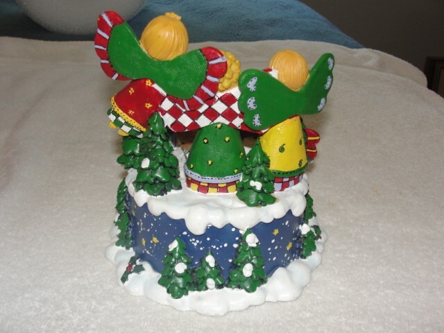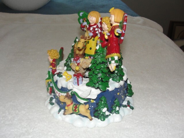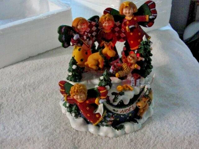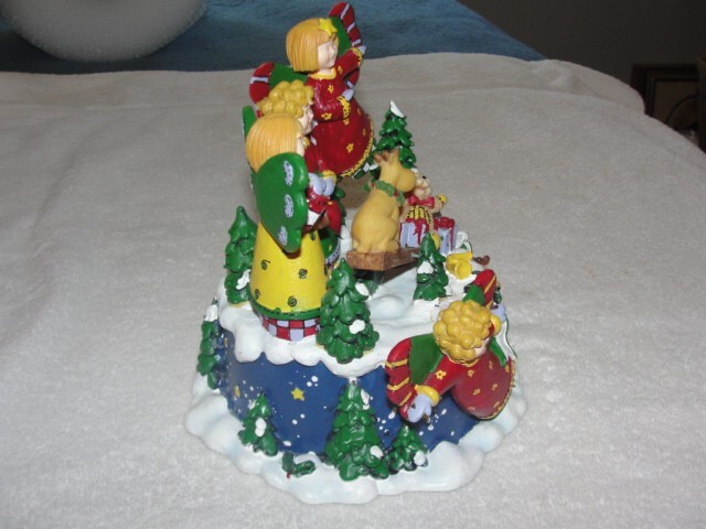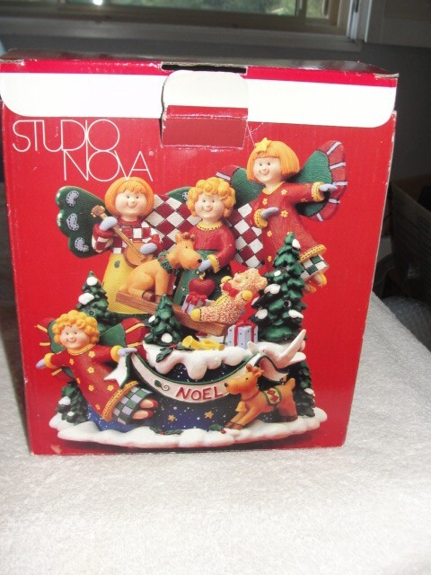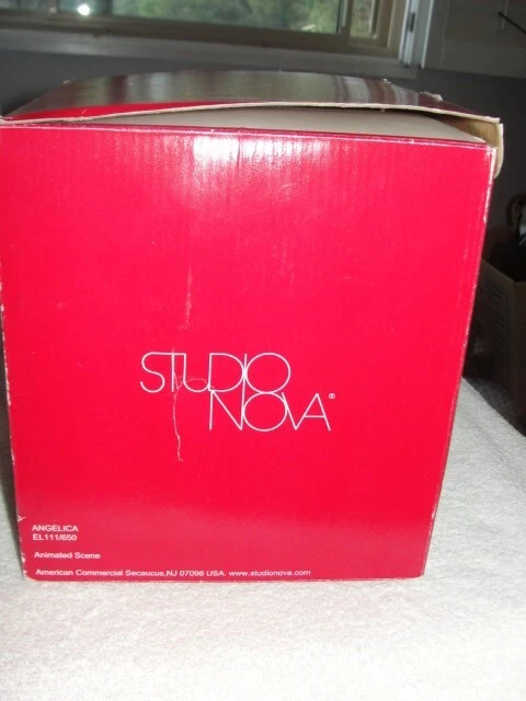 Studio Nova Noel Angles and Reindeer and bear. Wind up and put 2 double AA batteries in lights flash plays music and reindeer and bear go up and down on seesaw. Really great looking Christmas display. Does have marker writing on bottom shown in picture. Will be shipped in original box inside of shipping box. will not ship with batteries.