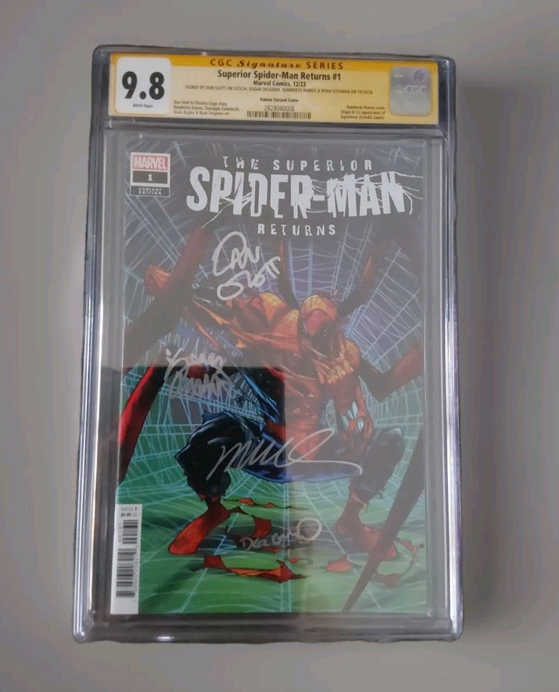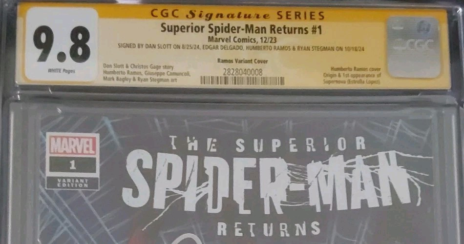 Please see pictures. Buy from a trusted seller of high-end collectibles and see our reviews. This sale is Final, let us know if you have any questions. This is a signed variant comic book titled "Superior Spider-Man Returns #1" featuring autographs from Humberto Ramos, Ryan Stegman, Dan Slott, and Edgar Delgado. It is professionally graded as 9.8 Near Mint/Mint by Certified Guaranty Company (CGC) and is in English language. The comic is part of the Superior Spider-Man Returns series and is intended for a general audience. It is a color comic book in single issue format from Marvel Comics.
