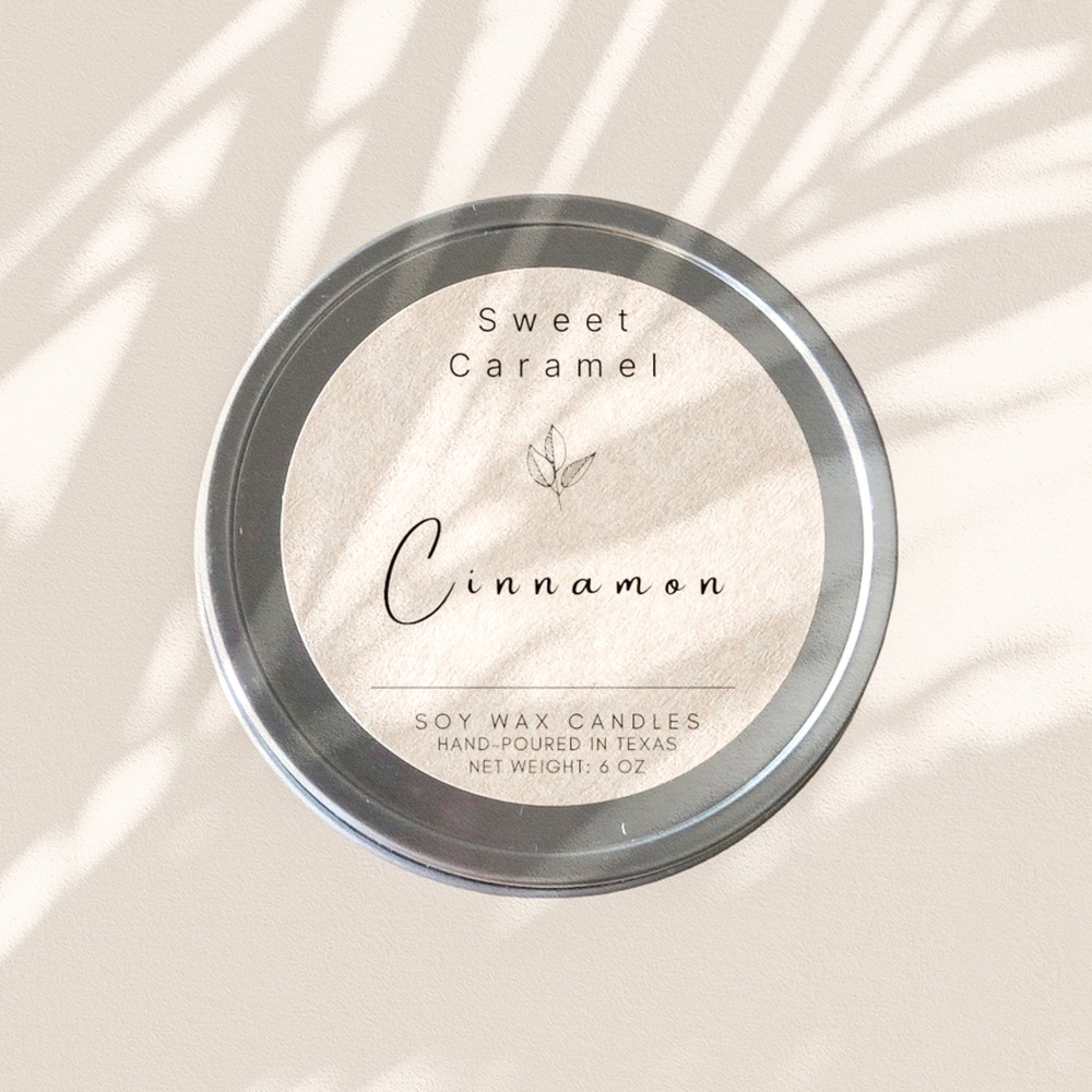 Let warmth wrap around you with every flicker of our Sweet Cinnamon Candle . Hand-poured in Texas with clean-burning soy wax, this 6 oz tin delivers the nostalgic aroma of raw cinnamon sticks with notes of nutmeg and ginger—just like grandma’s kitchen on a crisp autumn day. Whether you're curling up with a good book, setting the mood for a slow morning, or giving the perfect gift, this candle brings the cozy. The soft, minimalist label and travel-friendly tin make it both beautiful and practical—ideal for home, gifting, or taking a little comfort on the go. Light it, breathe in, and be transported to your warmest memories.