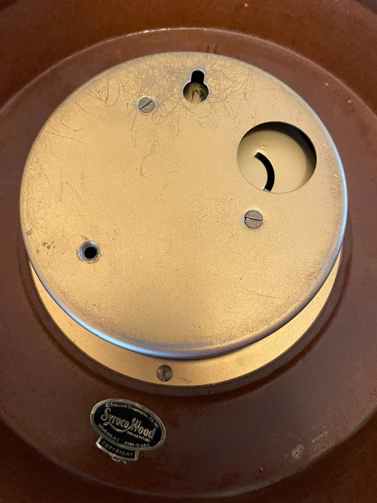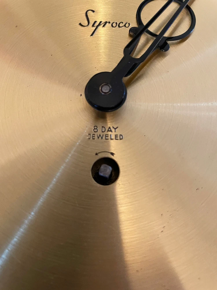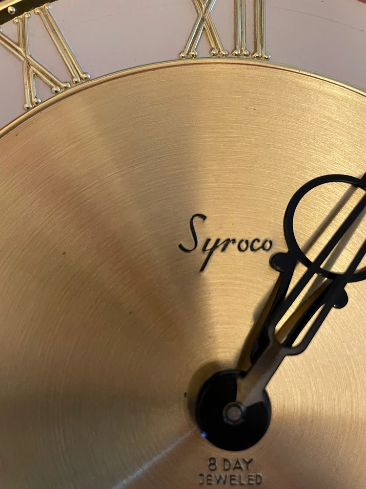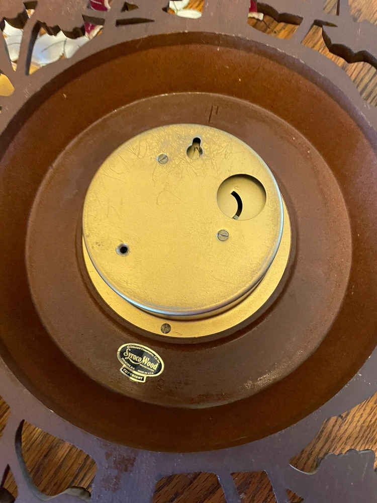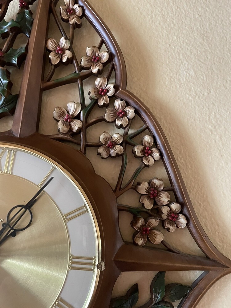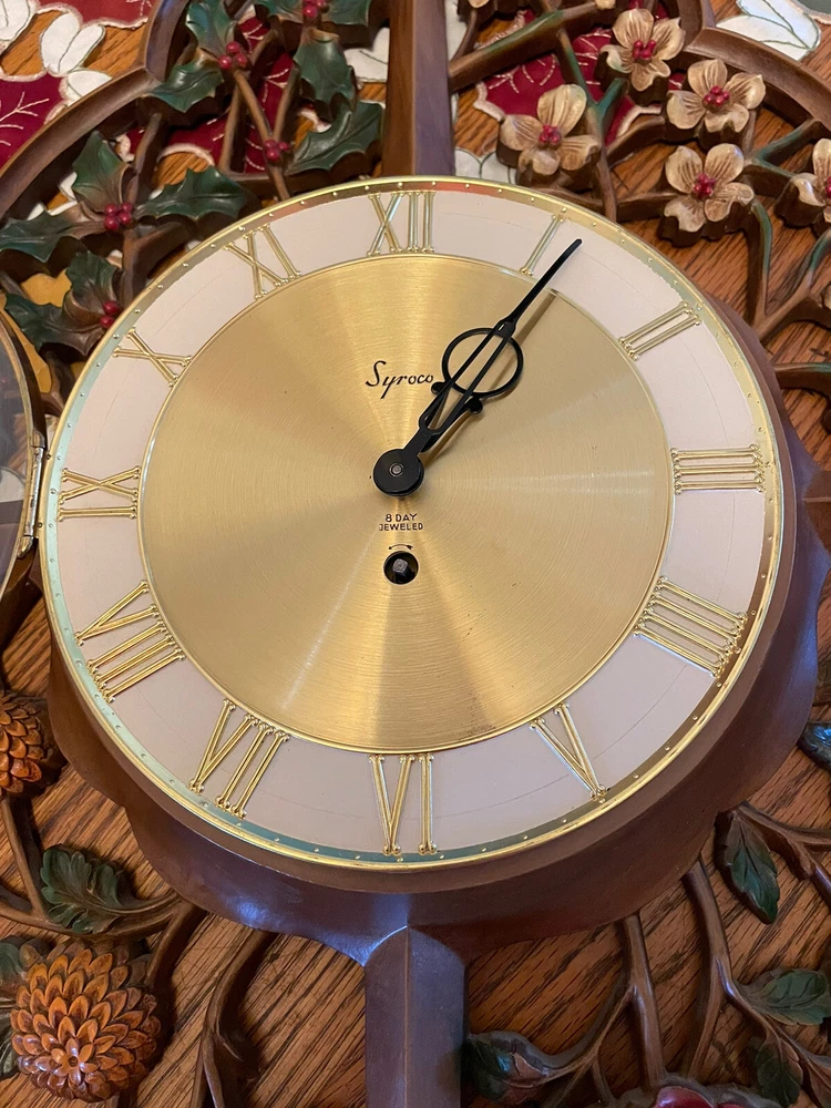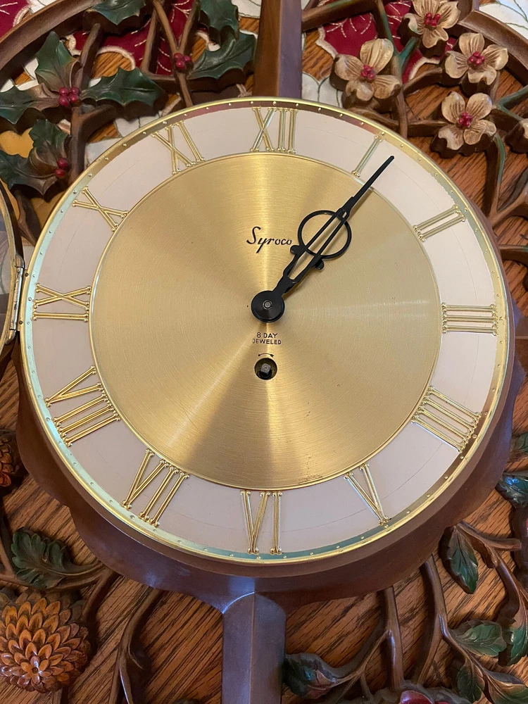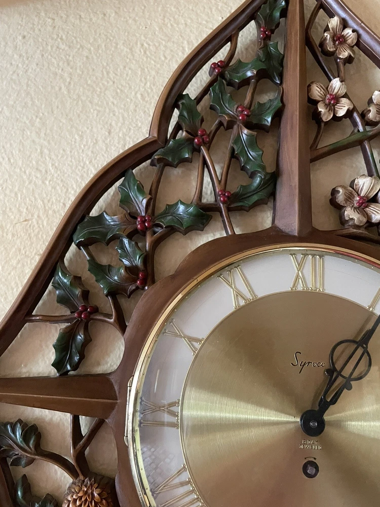 This vintage wall clock is a mid-century masterpiece that showcases the beauty of four seasons with a gorgeous floral pattern. The clock has an analog display type and a mechanical movement powered by key wind. Measuring 30 inches in height, it is made of polyurethane and plastic/resin material with a syroco frame that adds a touch of retro charm to any room. The clock is in its original condition and has an 8-day feature with no engraving or modifications. It is “jeweled” as inscribed on the metal back. It is suitable for any room, including the bedroom, home office, dining room, hallway, and basement. This wall clock is a true gem that captures the essence of mid 20th century design and is perfect for collectors or anyone who appreciates vintage decor. There is no key to test the running condition. Lost in storage some where. But these small 4 sided key is pretty readily available. SEE PICTURES AND ASK QUESTIONS IF YOU HAVE ANY.