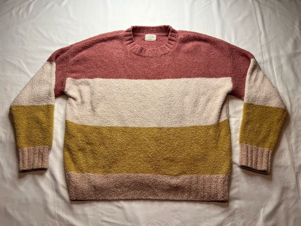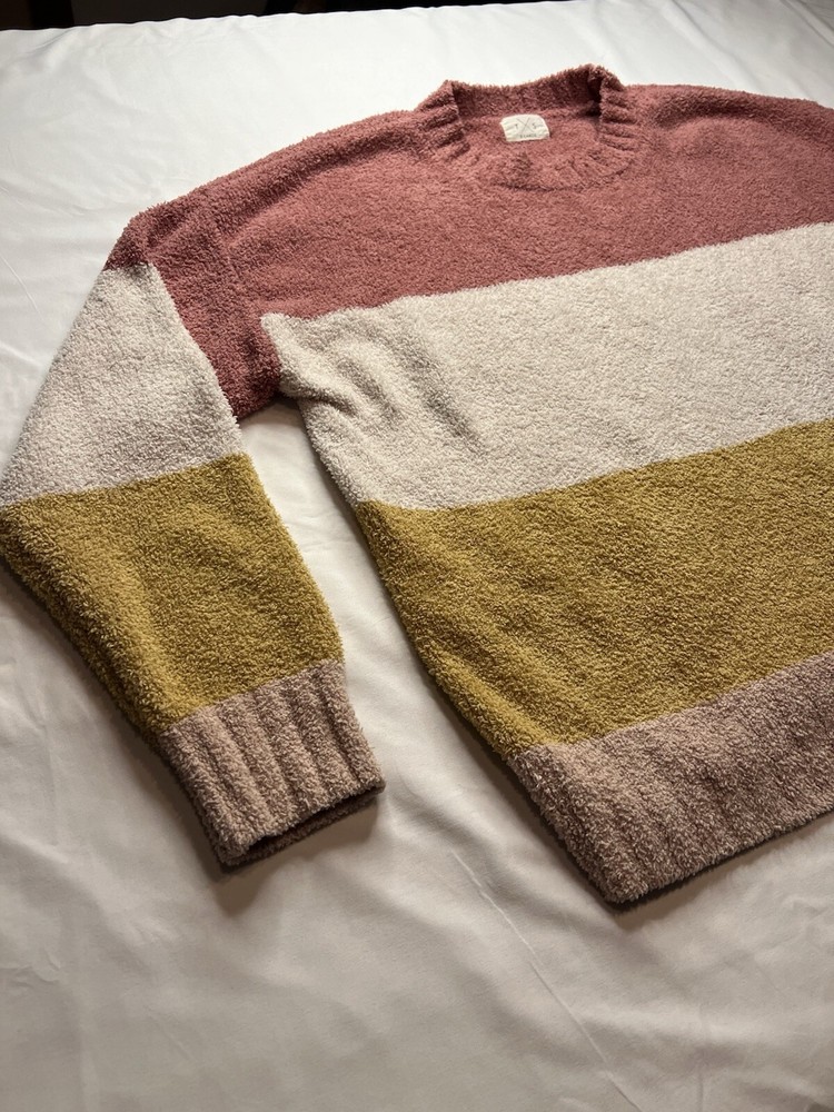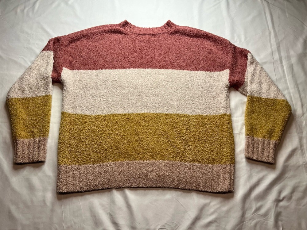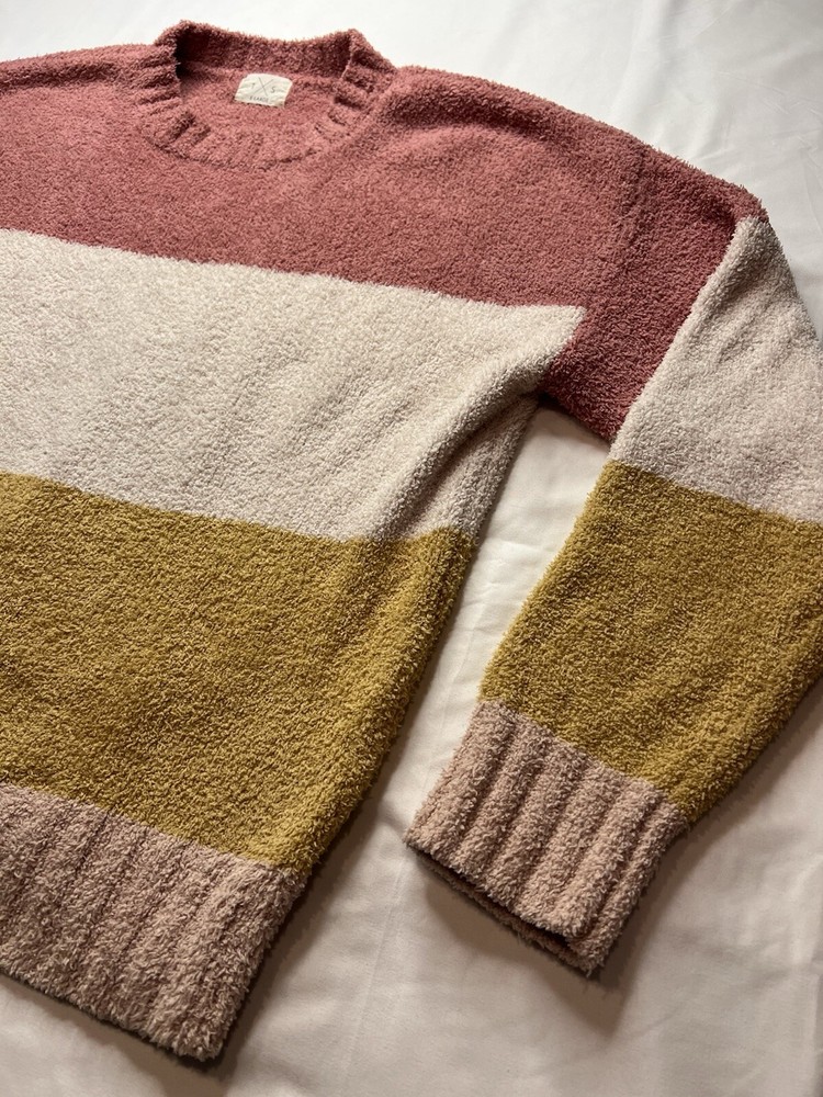 The T S Soft Cozy Striped Colorblock Sweater is a preppy and comfortable vineyard-themed pullover for women. It features a striped pattern in cream and has a regular fit. The sweater is made of high-quality material and is perfect for everyday wear. With its modern style and comfortable feel, it is a must-have addition to any wardrobe.