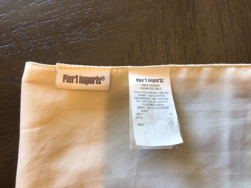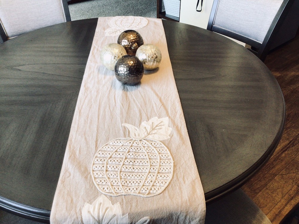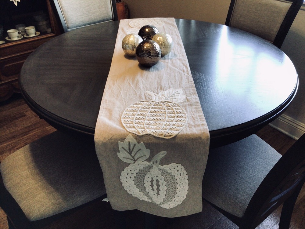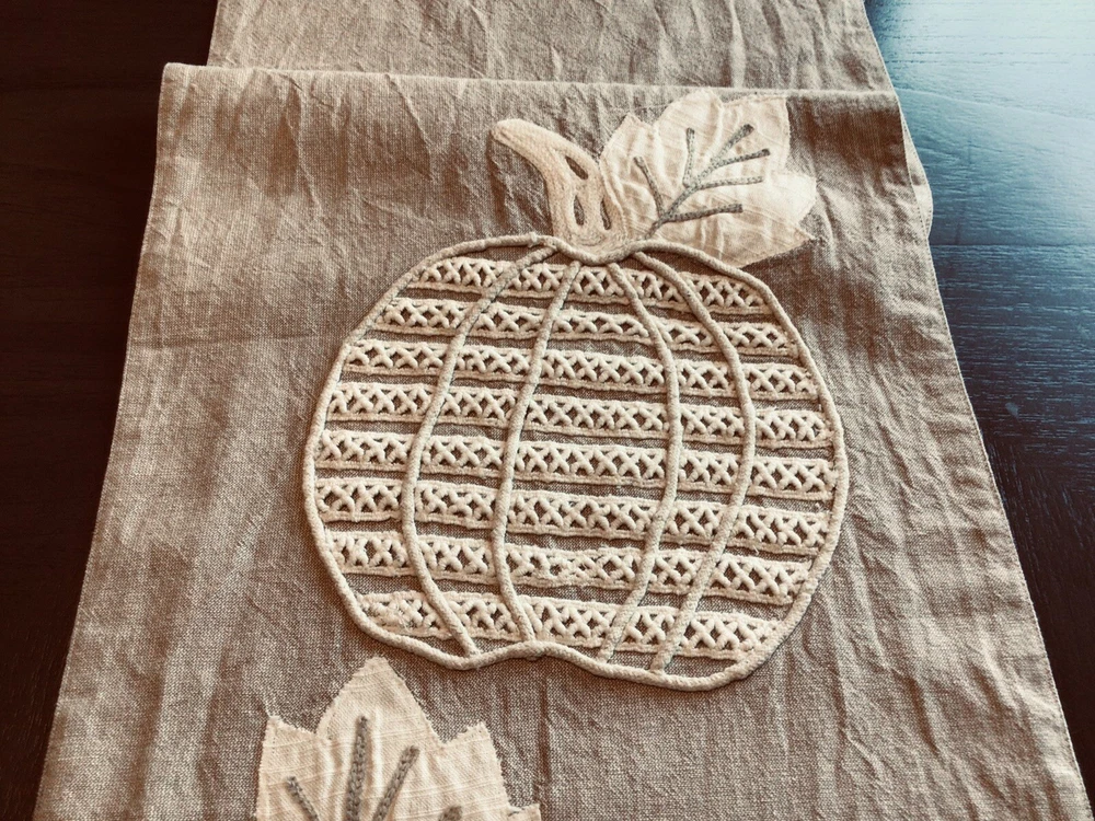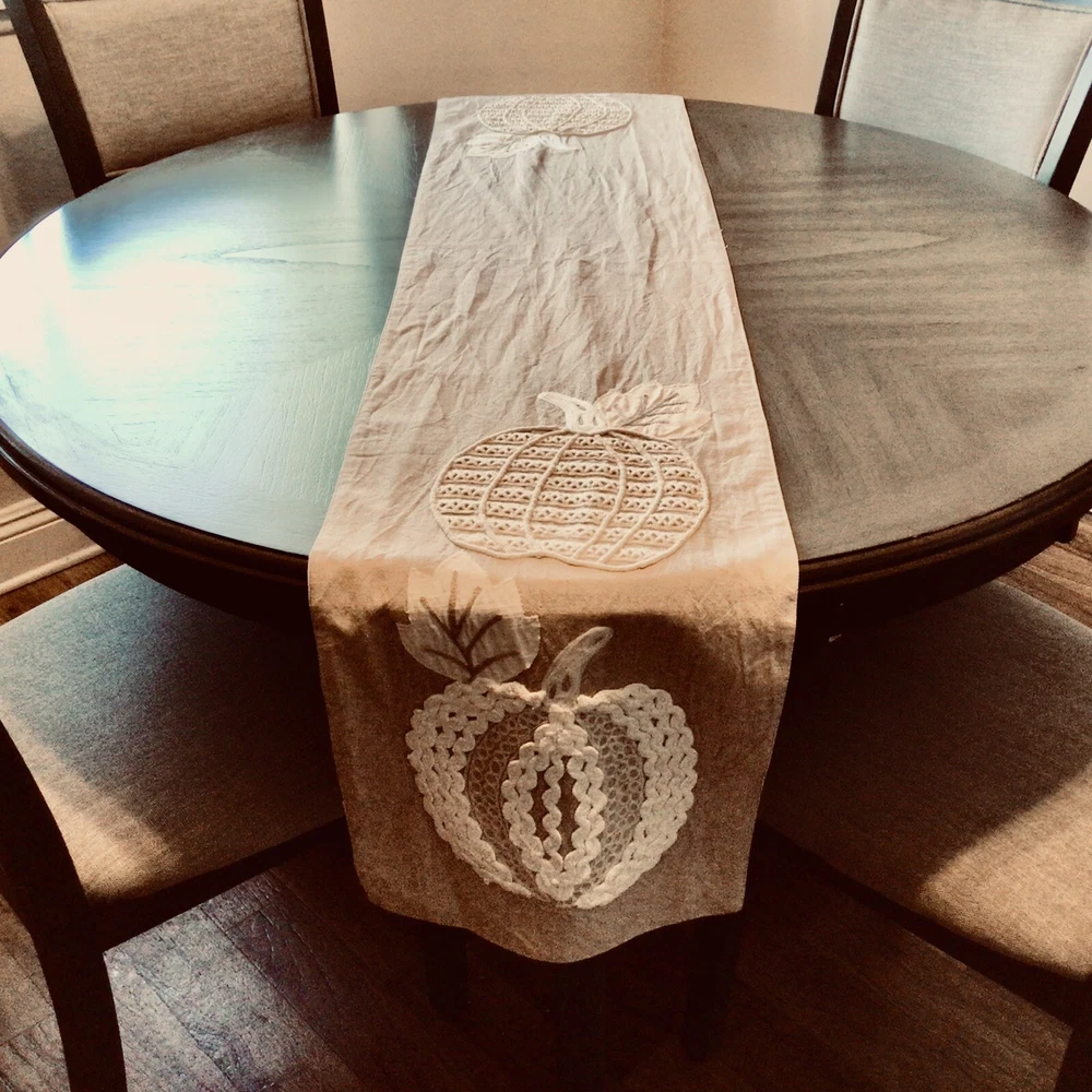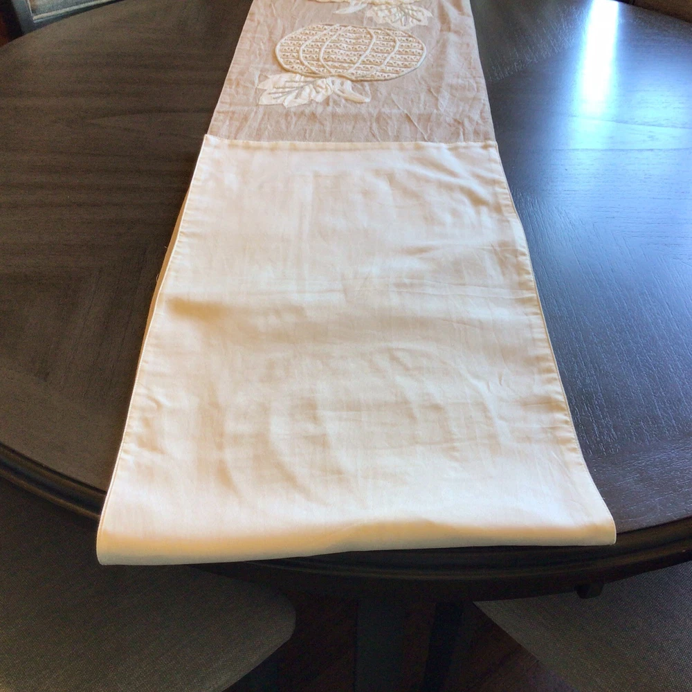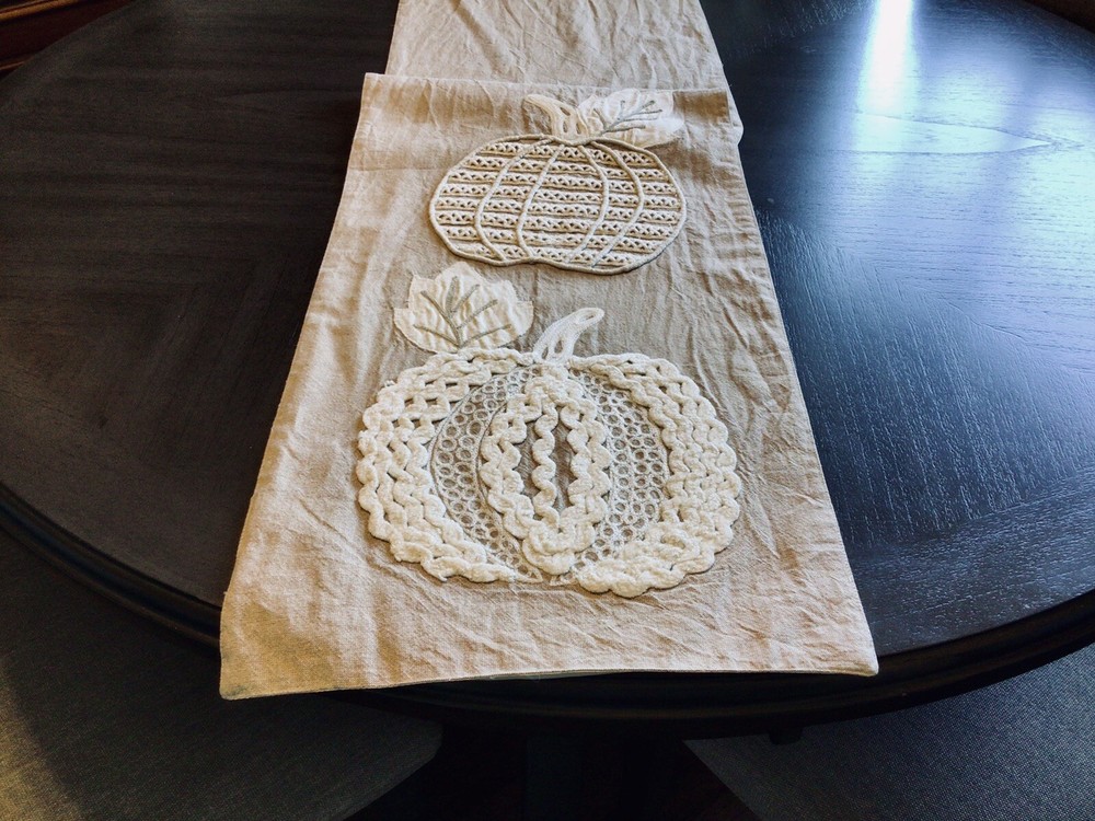 Ready for any table decoration occasion. Overall color of runner are done in beige and off-white and tan colors. Pumpkins are embroidered in the off-white color. There are four (4) pumpkins on this runner, two (2) at each end of the runner. The pumpkins have off-white, tan and beige colors decorating them. Materials: Front: 100% Cotton Decorations: 54% Viscose 37% Cotton 8% Acrylic 1% Other Fibers Back: 100% Polyester Spot Clean Only Dimensions: Length 72” x Width 13” Decoration Not Included