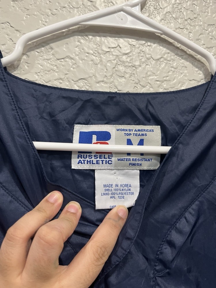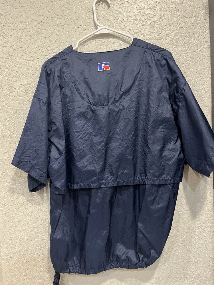 This vintage Russel batting coach shorts sleeve windbreaker is a must-have for any athlete. The drawstring closure and adjustable straps make it easy to adjust to your specific needs. The nylon material is water-resistant and perfect for all seasons. The blue color and athletic fit make it a stylish addition to your activewear collection. This pullover is perfect for baseball, soccer, and cross-training. The Russel brand has a long history of producing quality products, and this windbreaker is no exception.