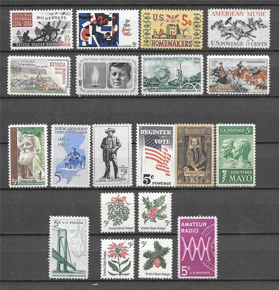 T&G STAMPS - 1964 COMPLETE YEAR SET ALL MNH 20 STAMPS T&G STAMPS - 1964 COMPLETE YEAR SET ALL MNH 20 STAMPS Click image to enlarge Description ***** ** ** USA STAMPS ***** **** Complete set of 20 stamps - all stamps are MINT NEVER HINGED - all stamps issued in 1964. These come from a smoke free home. (file photo is used) Very nice centering on this year set. Excellent way to complete an entire year set at a great price. Display sheet not included. PLEASE READ BELOW CAREFULLY Please understand this is a stock scan $1 FIRST ITEM - ADDITIONAL ITEMS .25c EACH If you have any questions - please ask prior to bidding. We only except PAYPAL as payment method. WE SHIP OUT LOT DAY AFTER PAYMENT RECEIVED. THANK YOU FOR LOOKING AND GOOD LUCK WITH YOUR BID!! If you purchase more than one item please wait or request final invoice before paying. NO RESERVE SORRY NO INTERNATIONAL Pictures sell! Auctiva offers Free Image Hosting and Editing. 300+ Listing Templates! Auctiva gets you noticed! The complete eBay Selling Solution. Track Page Views With Auctiva's Counter