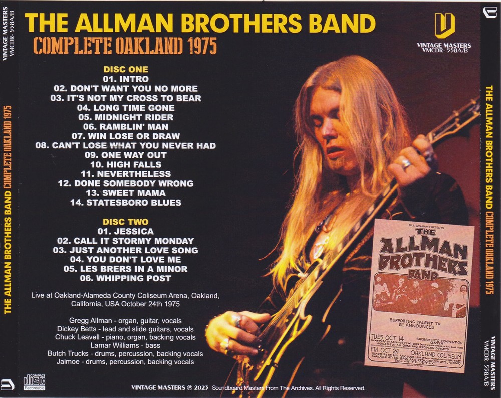 Wellcome to our ebay store! We strive to provide a safe and reliable source of musical goods from Japan to the world. Please take your time to look at the descriptions ♪ THE ALLMAN BROTHERS BAND - COMPLETE OAKLAND 1975 (2CDR) Description The Allman Brothers Band's 1975 US tour, October 24th at the Alameda County Coliseum in Oakland, California, is now available as a complete concert version with high quality stereo soundboard recordings! This live performance, which continued with Gregg Allman and Dickey Betts overcoming the deaths of successive members, was later released as a live album "Hot Wind," and this is the complete version of the performance that included the song "Jessica." Although this complete version of the sound source has perfect sound quality, there are some parts where only a part of the multi-track was recorded due to unstable PA during recording, and there are some unstable and unnatural parts. As a result, it was revealed with the release of this sound source that the middle part of "Jessica" recorded on the official live album was cut, and this includes the unstable part that was cut. With a full set list from early blues numbers to the single hit "Ramblin' Man," this is a live recording that you cannot miss as the best live performance of this period! DISC ONE 01. Intro 02. Don't Want You No More 03. It's Not My Cross To Bear 04. Long Time Gone 5. Midnight Rider 06. Ramblin' Man 07. WinLose Or Draw 08. Can't Lose What You Never Had 09. One Way Out 10. High Falls 11. Nevertheless 12. Done Somebody Wrong 13.Sweet Mama 14. Statesboro Blues DISC TWO 01. Jessica 02. Call It Stormy Monday 03. Just Another Love Song 04. You Don't Love Me 05. Les Brers In A Minor 06. Whipping Post Live at Oakland-Alameda County Coliseum Arena, Oakland, California, USA October 24th 1975 Shipping All packages are shipped directly from Japan by Small Packet(Japan Post) or Fedex We can provide the tracking number after shipment. Small packet tracking numbers are only reflected on shipments to the United States. Tracking numbers will not be reflected in other countries. * Please note that the small packet tracking number will be entered on the eBay transaction screen at the time of shipment, but it will not be reflected in countries other than the United States. FEDEX tracking number is reflected outside of the US Shipping to the US by Small Packet usually takes 7-20 or More days. Shipping to the US by Fedex usually takes 2-7 or More days. Shipping outside of the US by Small Packet will take 14-30 or More days. Shipping outside of the US by Fedex usually takes 2-7 or More days. Delivery times are estimates only. Please be aware that shipping may be delayed depending on postal circumstances and customs clearance procedures, so please be aware of this before purchasing. We will ship your item within 3-5 business days ( Closed on Saturdays, Sundays, and Holidays ) with carefully packed. In the case of multiple orders, the items will be shipped together, so the discount will be calculated based on the combined shipping cost, not the total shipping cost for each individual item. If you contact us in advance, we will be happy to advise you on the combined shipping charges, so please feel free to contact us. Also, please rest assured that even after placing your order, if the items are shipped together, we will refund the difference in price. International Buyers - Please Note: CDs and DVDs have been confirmed to work with the player device. The seller is not responsible for reading errors caused by computer software (iTunes, Windows Media Player, etc.) Please note that we do not accept returns or exchanges because the problem is caused by the computer. Import duties, taxes, and charges are not included in the item price or shipping cost. These charges are the buyer's responsibility. Please check with your country's customs office to determine what these additional costs will be prior to bidding or buying. Thank you for your understanding. About Feedback Feedback is a very important element in eBay transactions. If you have any problems with your transaction, please feel free to contact us. Please be sure to contact us before leaving negative feedback because the item arrived later than the buyer expected. We are committed to conducting pleasant and honest transactions.
