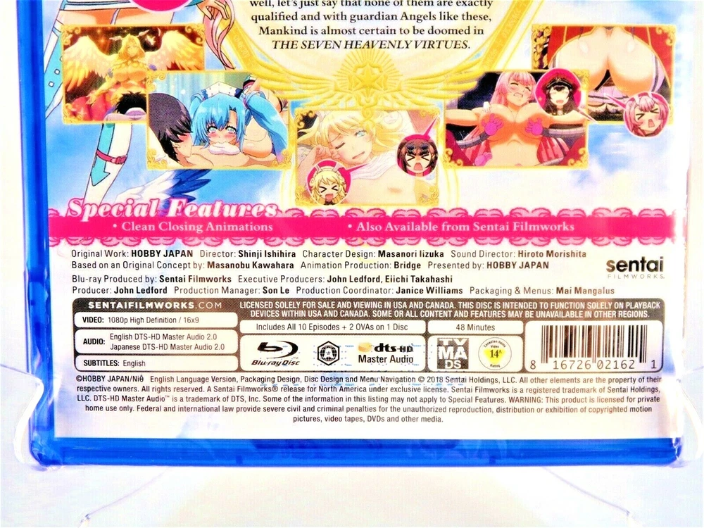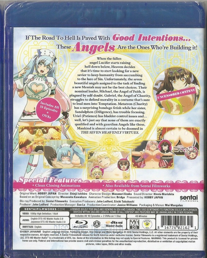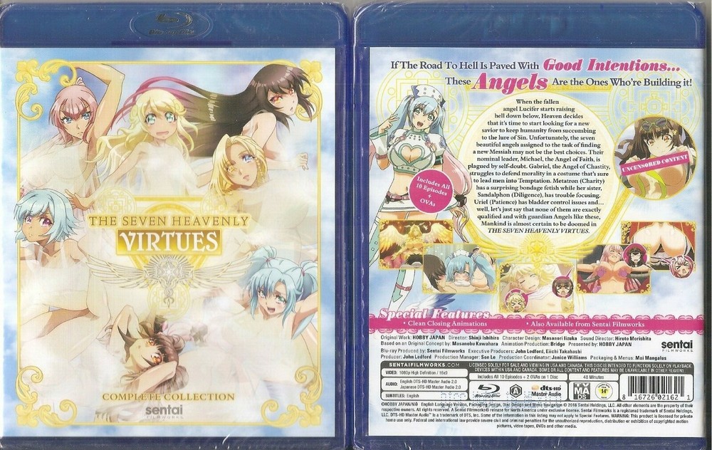 BRAND NEW FACTORY SEALED Seven Heavenly Virtues Blu-ray SKU: 816726021621 Seven Heavenly Virtues contains episodes 1-12 of the anime directed by Shinji Ishihara. When the fallen angel Lucifer starts raising hell down below, Heaven decides that it's time to start looking for a new savior to keep humanity from succumbing to the lure of Sin. Unfortunately, the seven beautiful angels assigned to the task of finding a new Messiah may not be the best choices. Their nominal leader, Michael, the Angel of Faith, is plagued by self-doubt. Gabriel, the Angel of Chastity, struggles to defend morality in a costume that's sure to lead men into Temptation. Metatron (Charity) has a surprising bondage fetish while her sister, Sandalphon (Diligence), has trouble focusing. Uriel (Patience) has bladder control issues and… well, let's just say that none of them are exactly qualified and with guardian Angels like these, Mankind is almost certain to be doomed! Special Features: Clean Opening Animation and Clean Closing Animation. Details Publisher: SENTAI FILMWORKS Media: Blu-ray A Spoken Language: English, Japanese Subtitle Language: English Genre: Drama, Fantasy Age Rating: TVMA Run Time: 50 Release Date: 10/16/2018