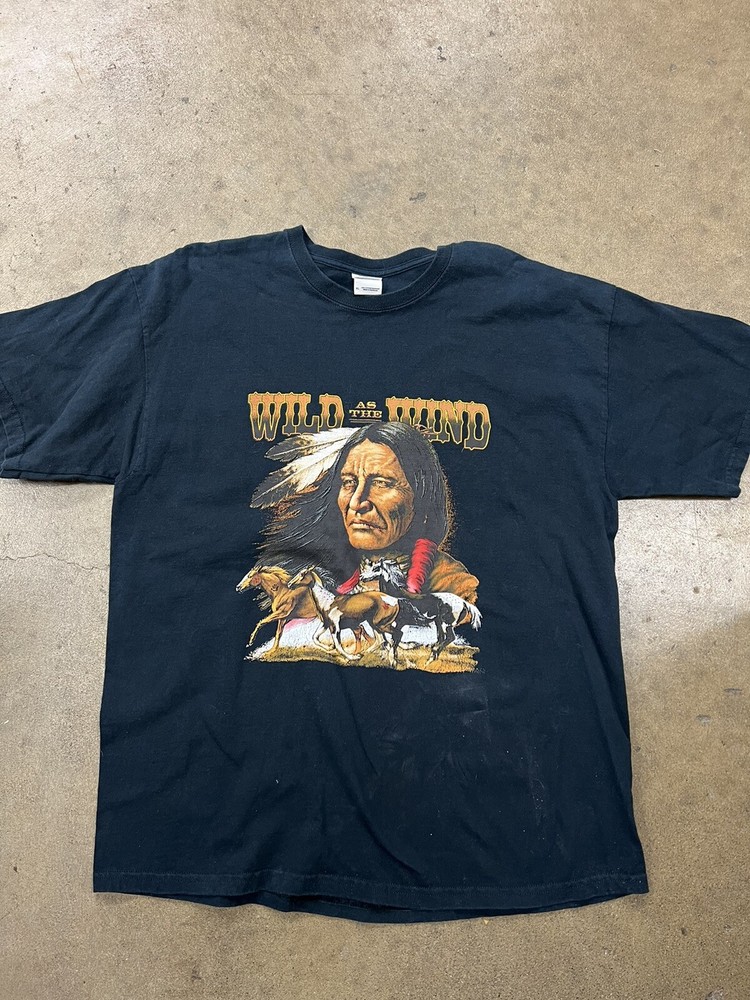 T-Shirt Wild As The Wind X-Large Black Vintage Indian Horses 90s Native American. Men’s X-Large Also, that isn’t a stain or bleach stain, it got a little dust on it when I laid it down...