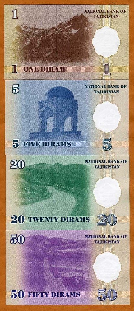 National bank of Tajikistan, 1-5-20-50 Diram, Complete Fractional Set. 1999 (2000) P-10-11-12-13, Ex-USSR O riginal paper, sharp corners, full original colors. Crisp banknotes, no pinholes or paper splits, no folds, no creases. Original paper sheen. Grade: Gem Uncirculated One flat shipping charge, worldwide, no matter how many auctions you win. We are members of the ANA & IBNS (Become a subsriber to my Ebay store and get free email updates on what is new at the store and what is coming. Also get access to special deals, discounts and promotions designed for subsribers only) Please read the terms of sale and shipping terms before you bid, to make sure you understand them correctly. Email me if you have any questions. USA buyers pay $2.50 and ALL International bidders pay $3.00 for for 1st class mail postage. Registered mail is $17.50. Priority mail is available for $9.00 and INTERNATIONAL priority mail is $42.00 (where available). Only one shipping charge per shipment no matter how many items you buy (combined shipping)