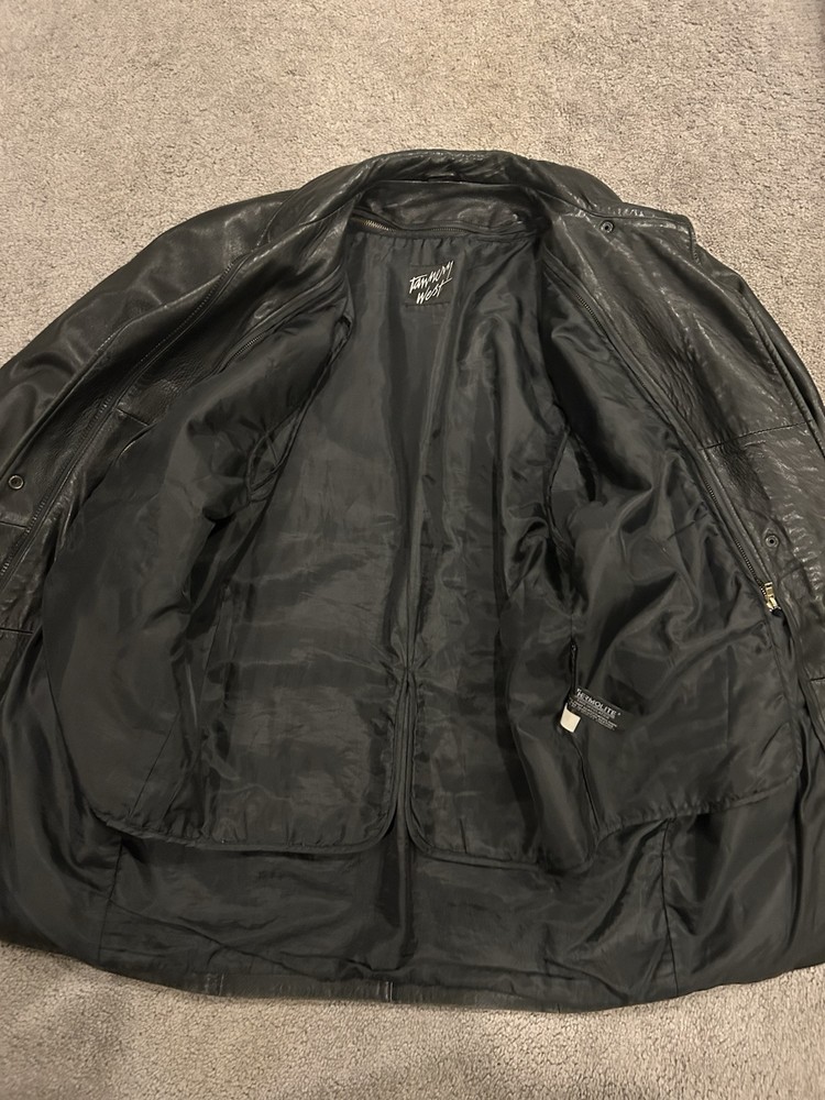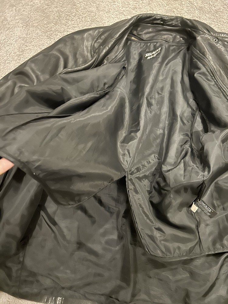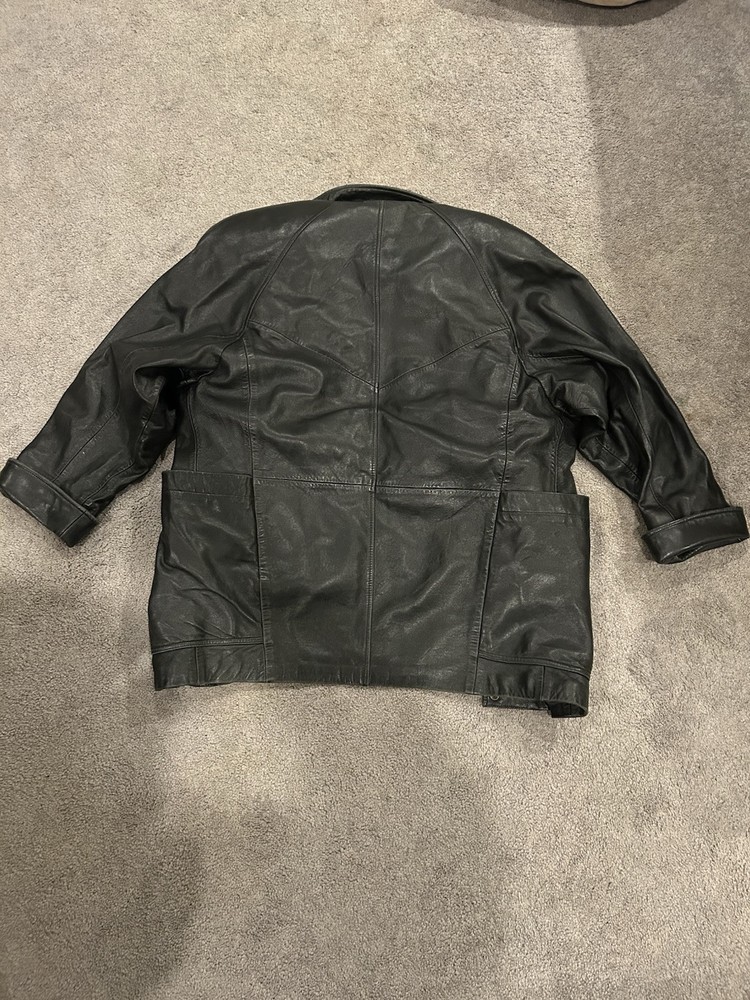This is a Tannery West Vintage 90's Leather Jacket for men in size XL. It is a black bomber jacket with a mid-length fit, featuring a zip closure. The jacket is made of leather with a polyester lining, suitable for various occasions such as travel, parties, casual wear, and formal events. It has a relaxed fit and is designed to be wind-resistant and suitable for all seasons.