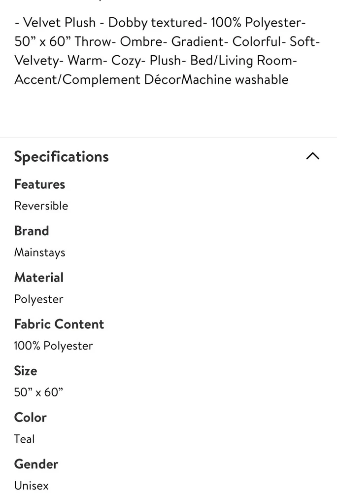 Add a colorful piece to your humble abode with this Mainstay Ombre Dobby Velvet Plush Throw! Crafted with a dobby textured version of our ultra-smooth Velvet Plush fabric, this throw is the ultimate cozy essential that you will love cuddling up with when temperatures drop. The gradient Teal Ombre design has cool tones that will liven up your living room or bedroom. It is low-maintenance, machine washable, and will provide unmatchable warmth when you need it most!