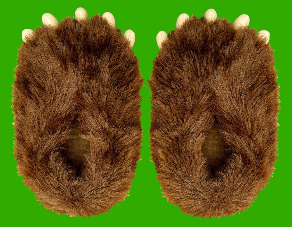 Adult / Teen Bear Paw Slipper Fits from a Ladies Shoe Size 5 to Men's Shoe Size 9 1/2 Slipper Sole Measures 11" x 8" Less Fabric Claws Adult size bear paw slipper with cloth bear claws. Rich Brown Teddy Bear Soft Polyester Fur 5 Soft Quiet Dangly Fabric Bear Claws Foam Cushioned Insole Light weight Bear Paw Claw Slippers have a pillow soft lightness. Fit snuggly around ankles. Slip Resistant Bear Paw Sole Pad Great Paws For Bear Or Animal Costumes Everyone Loves These Bear Paw Slippers With Dangly Claws! -Sole Measures 11" X 8" (less claws)