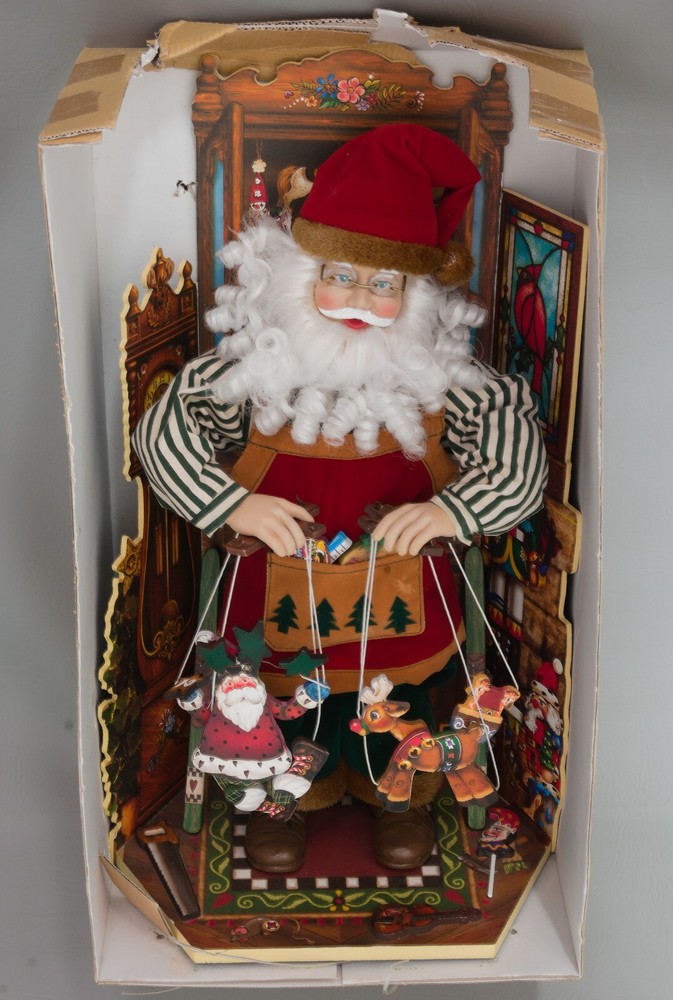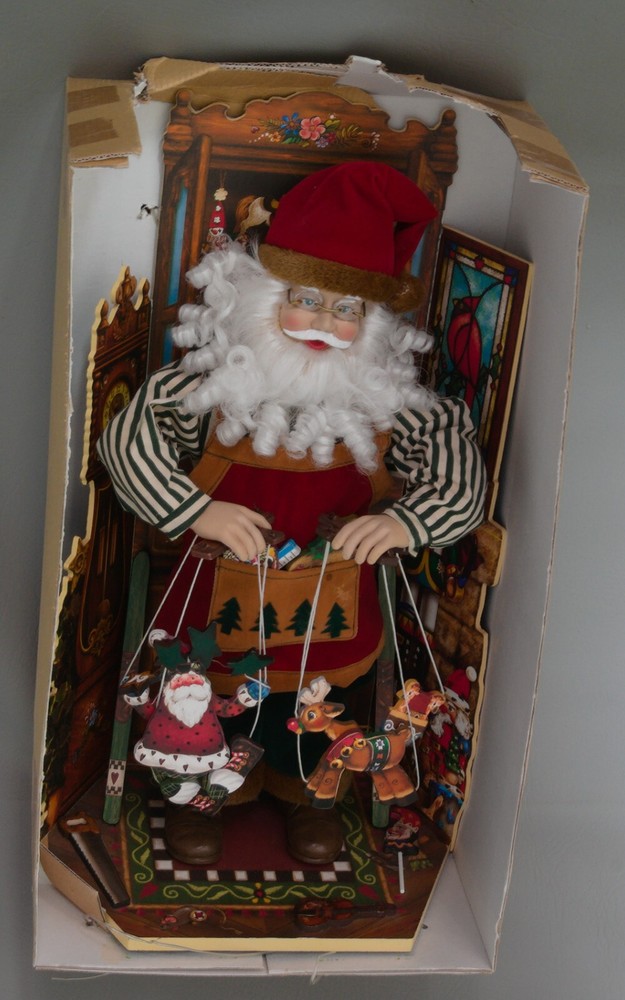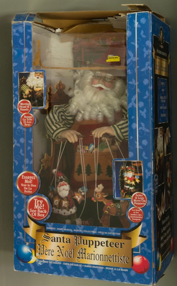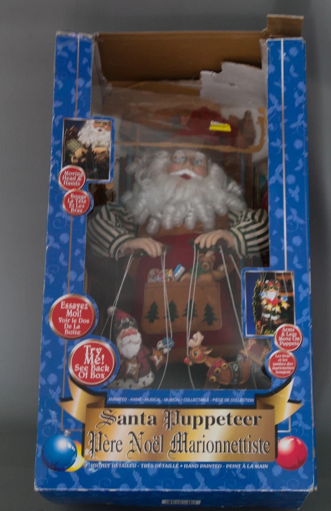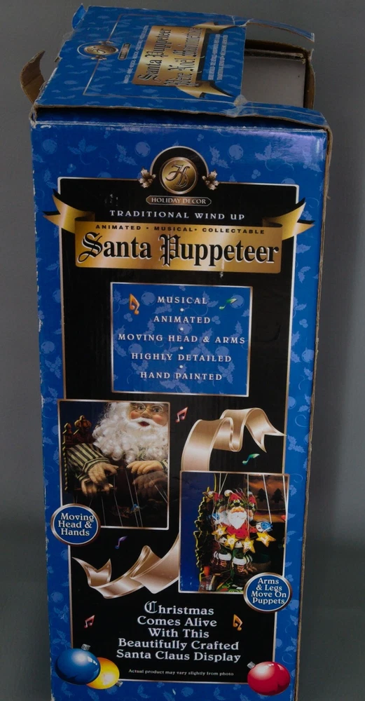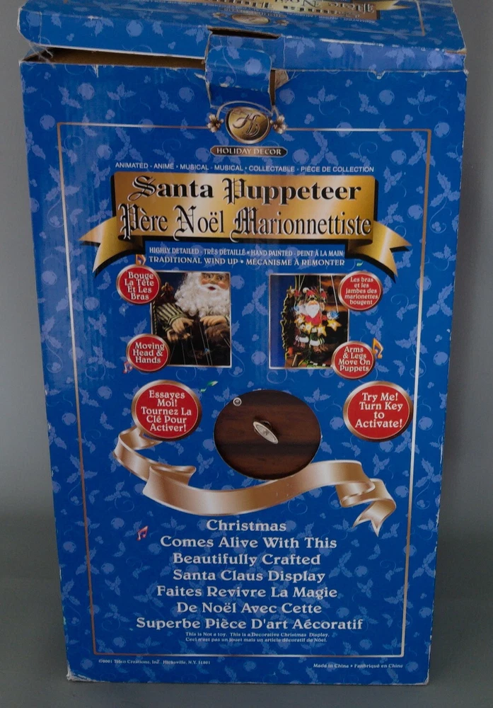 The Telco vintage 2001 animated musical Santa Puppeteer wind-up Christmas decor is a charming collectible figurine featuring Santa Claus. This whimsical and nostalgic piece brings a touch of festive cheer to any holiday decor with its multicolor design and musical features. Perfect for collectors or those looking to add a unique and retro touch to their Christmas celebrations, this Santa Pupperteer is a fun and nostalgic addition to the holiday season. Wind up music and animation works. Box has a couple of small tears. See photos for full description.