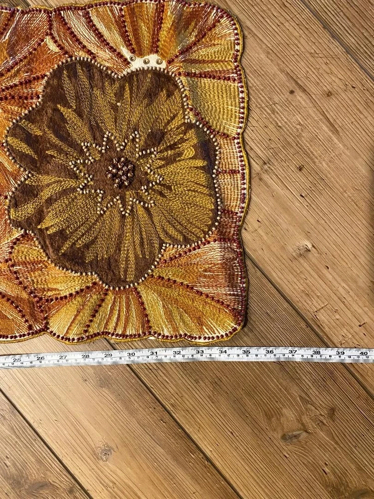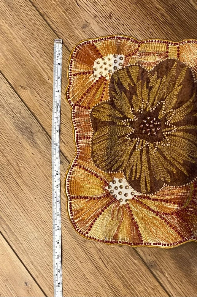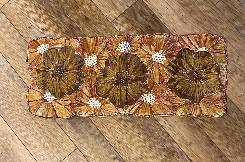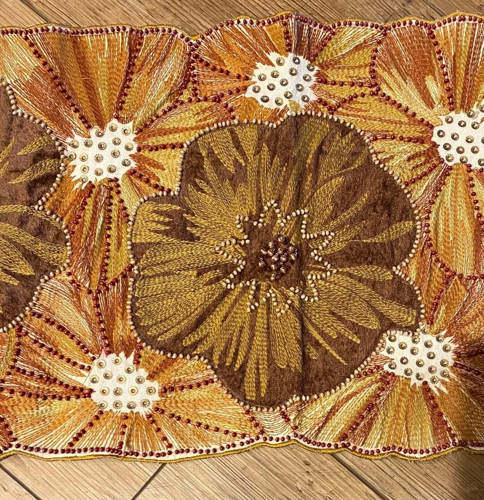 Beautiful Beaded/Embroidered/Embellised Table Runner from Pier 1. 15'x35' Perfect for the Fall with the gorgeous Fall colors! Very clean and not missing any of the beads. I've had this for years in storage and never used it!! MSRP: $49.95