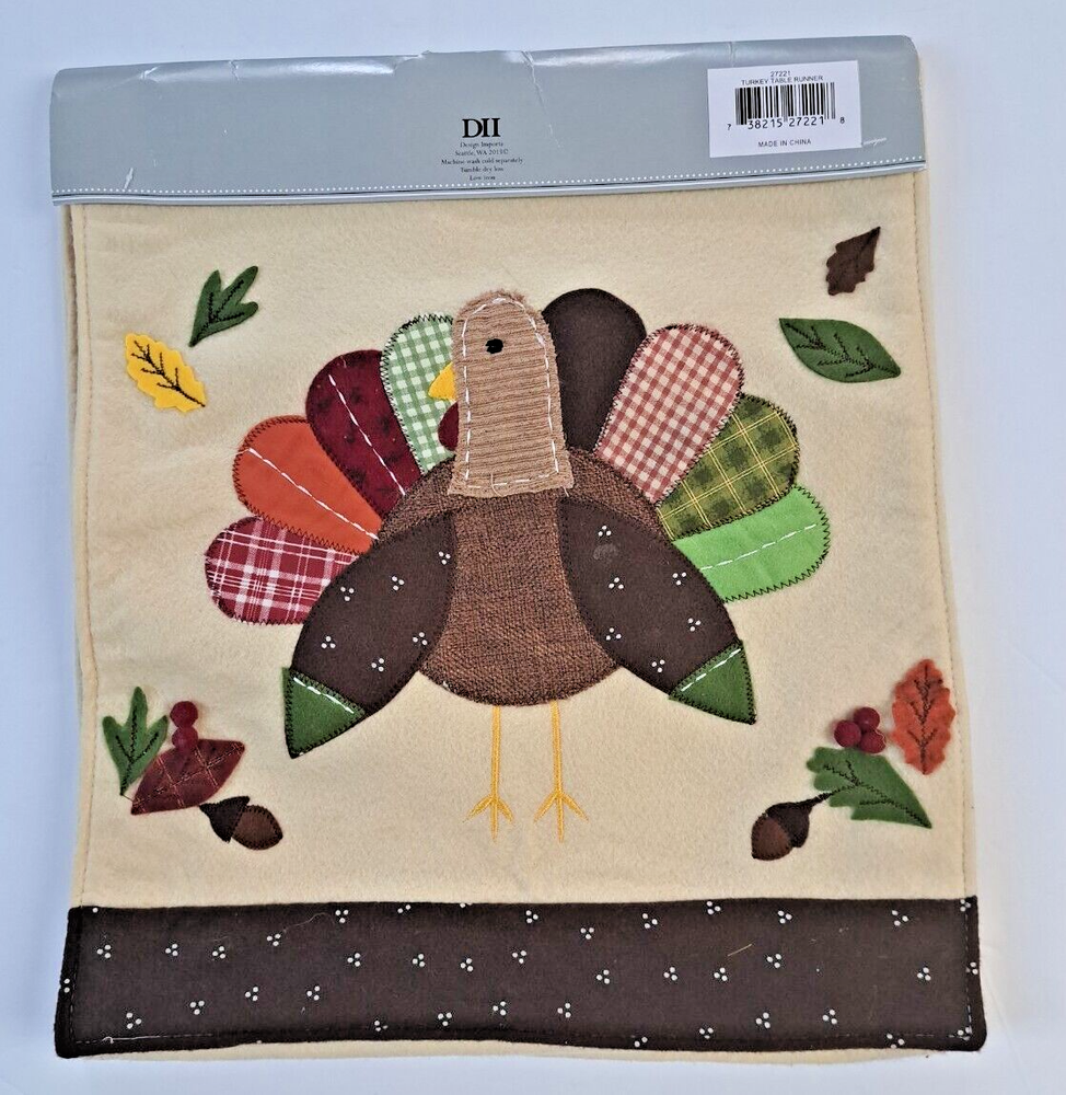 Add a touch of autumn to your table with this Thanksgiving Day table runner from Design Imports. The embroidered turkey design is perfect for the holiday season, and the rectangular shape and size of 14x64" make it a multipurpose addition to your home decor. Made from polyester, this table runner is easy to hand wash and features a farmhouse style that will complement any home. I try to give the best quality products I can find. Please keep in mind that the majority of my items are pre-owned. Therefore, they may show some signs of wear and age such as superficial scratches, small flee bites or flaws. I DO try to point out any and all defects, if applicable. Because I am not perfect , nor is the item, there may be some imperfections that are not caught. All items are stored in a smoke and pet free environment. I clean and wash all items to the best of my ability before they are shipped to the consumer. Payment is due immediately unless sold by auction or best offer. Items will ship within 3 business days of being sold and payment received. If you have any questions or concerns, please message me and I will respond as quickly as possible. Pictures represent the item as it is. Item color may vary depending on brightness and quality of your screen. Shiny objects may show some reflections and or glare. I feel I have described the item to the best of my knowledge. If you need additional information about the item, don't be shy, just ask I'll do my best to get the information to you as quickly as possible. My goal is to have satisfied buyers. Any measurements included are approximate. I do combine shipping on multiple purchases. When there is an overcharge for shipping, I will automatically refund the difference. Check out the other items in my store. Thank You for taking the time to view my items. Have a Safe and Blessed Day!