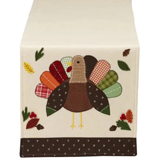Dress up any table top with this beautiful table runner. The patchwork turkey is sure to add some whimsy to any table! Product Details Primary Material: Polyester; Cotton Blend Reversible: No Recommended Wash Type: Hand wash Measures: 14'' D x 64'' L