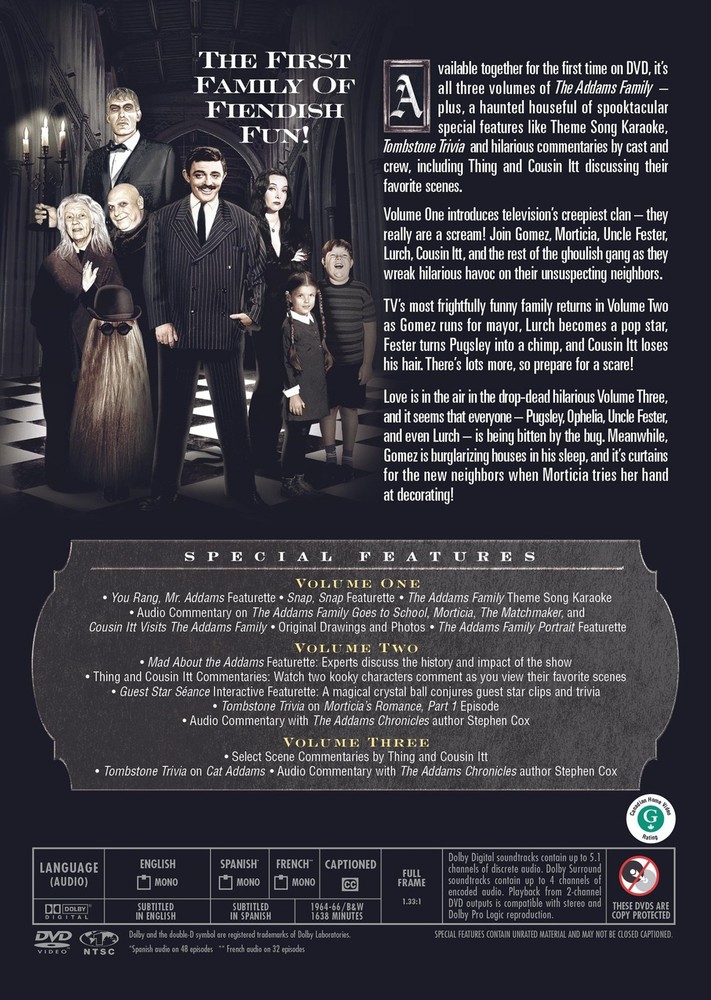 This DVD set is a must-have for any fan of classic TV! Carolyn Jones is brilliant as Morticia, bringing elegance and humor to the delightfully spooky Addams family. All three seasons are packed with witty, gothic charm, and the picture quality is fantastic. Perfect for binge-watching or sharing with a new generation—highly recommended!