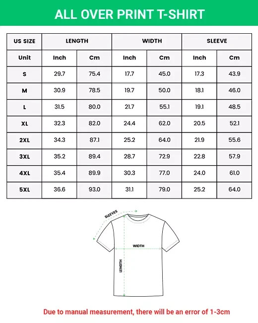 High-Quality 3D All-Over Print T-Shirt - Custom Design Elevate your wardrobe with our high-quality, all-over print t-shirts, manufactured in-house to ensure exceptional quality. Whether you want a design on the front, back, sleeves, or a fully printed t-shirt, our customization options have no limits or minimum order quantity. Create a unique design online with ease, and we guarantee a smooth and efficient design process. Exceptional Quality and Durability Material : 100% polyester fabric Printing Technique : Sublimated printing for vibrant, long-lasting colors that won't fade, crack, or peel. Unlike traditional screen printing, sublimated printing covers the entire shirt with eye-catching, durable designs. Construction : Includes double-needle hems and neck bands for enhanced durability. Customization Options Design on the front, back, and sleeves or opt for a fully printed shirt. Add logos, quotes, paintings, and drawings to create a one-of-a-kind piece. No limit or minimum order quantity ? perfect for individual and bulk orders. Shipping Information Country of Origin : US Average Est. Processing Time : 2-4 business days Average Est. Shipping Time : US: 4-7 business days EU: 10-20 business days Rest of the World (ROW): 10-25 business days Please allow an additional 2-6 days due to external factors beyond our control. Important Return Policy Information We prioritize your shopping experience, so please double-check your size and shipping address before placing your order. We only accept returns for the following reasons: Incorrect size based on the size chart provided. Items damaged or dented during shipping. Items significantly different from the description and images provided. If you encounter any issues, such as missing or damaged items during transit, please contact us directly via email. This approach ensures a faster resolution and helps avoid any negative impact on our business operations. We appreciate your understanding and cooperation. Customer Satisfaction We value your experience and aim to provide the best service possible. If you are satisfied with your purchase, please consider leaving us a positive review. Your feedback is incredibly motivating and helps us continue to grow and improve our business. Thank you for shopping with us, and we look forward to serving you again in the future. Have a wonderful day!