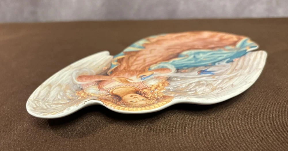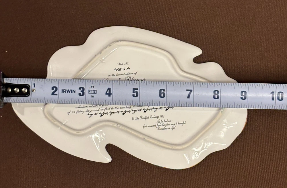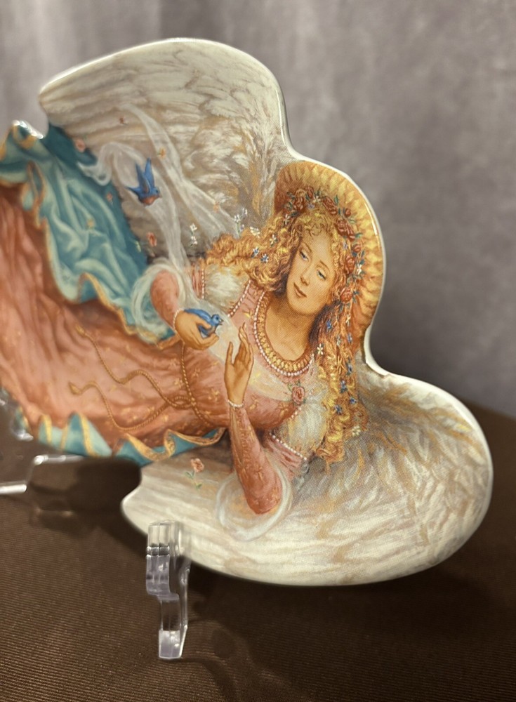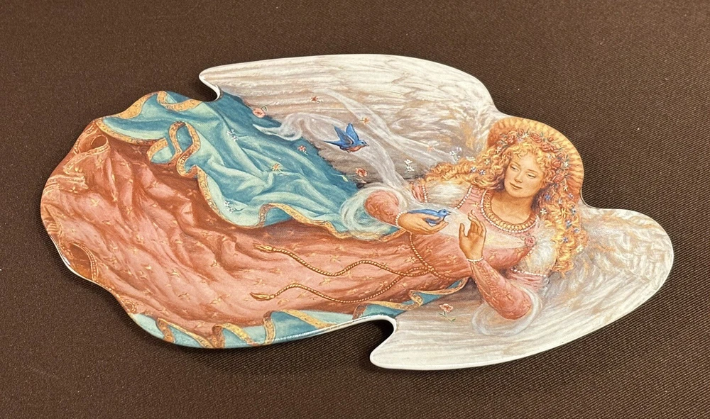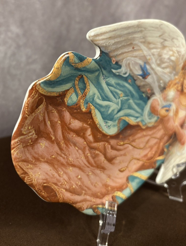The product is a collector plate from The Bradford Exchange, featuring an angel design. The plate is made of porcelain and is part of the Seasons of Joy product line. The plate is vintage and was produced in 1997. It is decorative in style and was made using art pottery techniques. The plate is multi-colored and has an outline shape of an angel. It is a Christian cultural item that can be displayed for all occasions. The plate's diameter varies, with approximated dimensions shown in pictures. This is a Preowned plate in excellent condition that was hung on a wall for display only. ****This does not come with stand in photos*****There is some slight sticky tack residue on parts of bottom edging as seen. Please review all photos prior to purchase* Packaged and shipped with care***