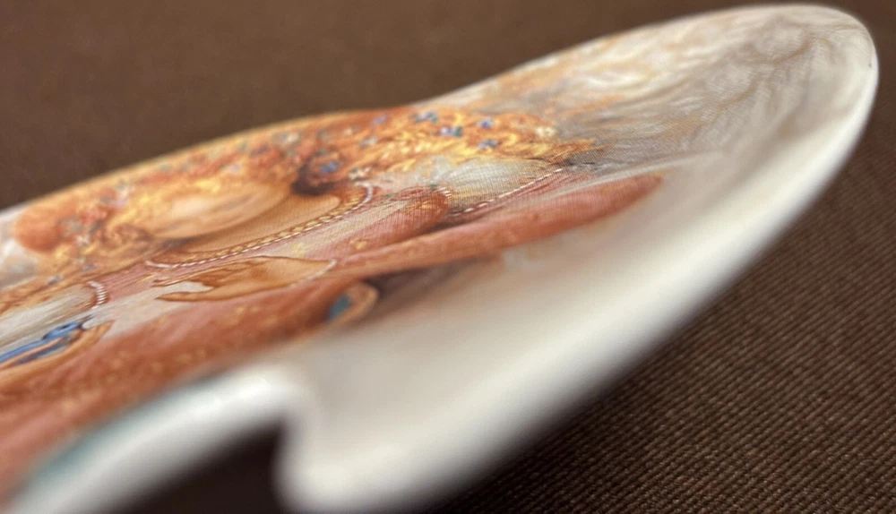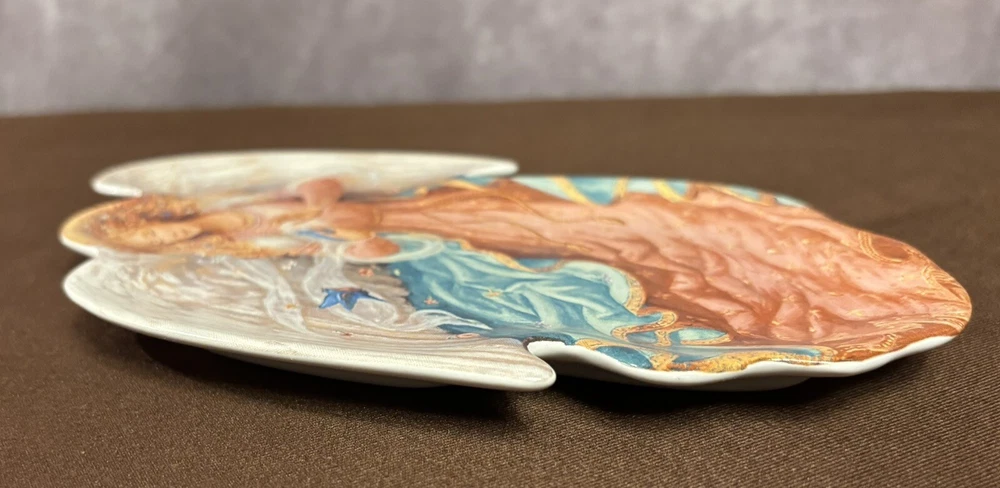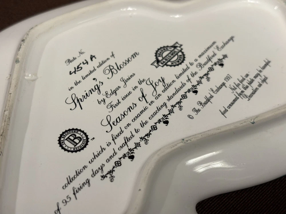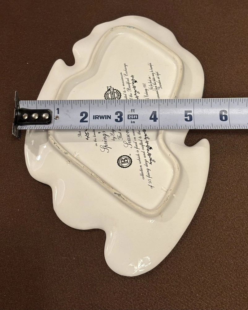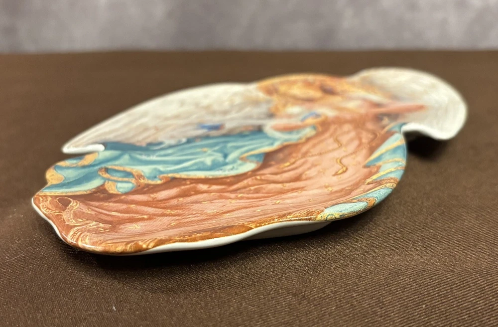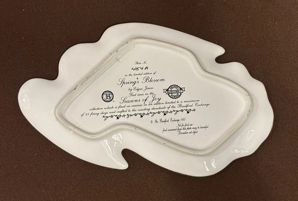 The product is a collector plate from The Bradford Exchange, featuring an angel design. The plate is made of porcelain and is part of the Seasons of Joy product line. The plate is vintage and was produced in 1997. It is decorative in style and was made using art pottery techniques. The plate is multi-colored and has an outline shape of an angel. It is a Christian cultural item that can be displayed for all occasions. The plate's diameter varies, with approximated dimensions shown in pictures. This is a Preowned plate in excellent condition that was hung on a wall for display only. ****This does not come with stand in photos*****There is some slight sticky tack residue on parts of bottom edging as seen. Please review all photos prior to purchase* Packaged and shipped with care***