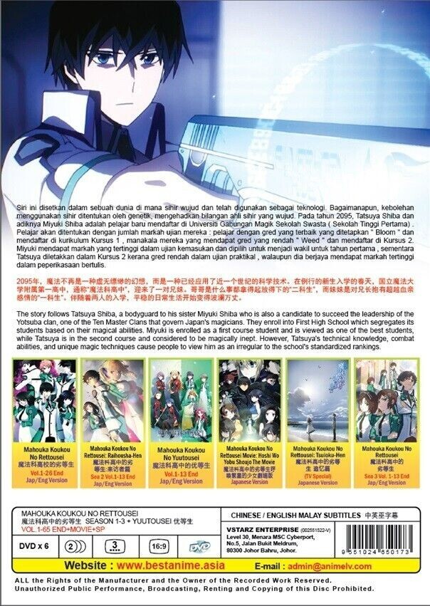 Get a FREE PINBADGE with every purchase The Irregular at Magic High School ( Mahouka Koukou No Rettousei ) Complete Collection Boxset (Year 2024) Season 1-3 + Yuutousei Volume (1-65 End) +Movie +Special Contents: 1) Mahouka Koukou No Rettousei Season 1 (1-26 End) English /Jap 2) Mahouka Koukou No Rettousei: Raihousha-Hen Season 2 (1-13 End) English /Jap 3) Mahouka Koukou No Yuutousei (1-13 End) English /Jap 4) Mahouka Koukou No Rettousei The Movie: Hoshi Wo Yobu Shoujo (Jap w/ English Subtitle) 5) Mahouka Koukou No Rettousei: Tsuioku-Hen (Special) (Jap w/ English Subtitle) 6) Mahouka Koukou No Rettousei: Season 3 (1-13 End) English /Jap Latest!! English Dubbed Version *Except The Movie & Special Episode (Japanese with English Subtitle) ~ All with Optional English Subtitles ~ - Region Free / All Region - ~ FREE International Shipping ~ Condition: Authentic, Brand NEW, Original Factory Sealed. No. of Discs: DVD x 6pcs * Region Code: All Region/Region FREE "0" ( Able to play on any DVD Players throughout the World) Audio Language: English* / Japanese Subtitles: English / Chinese Shipping and Packaging: Thank you for your interest in our product! We are pleased to offer free international shipping for this item. Please note that international delivery typically takes 2-3 weeks. At The Anime Zone, we prioritize the safe delivery of your orders. Our bubble wrapped packages provide excellent protection for fragile items. Each item is meticulously wrapped in multiple layers of high-quality bubble wrap to absorb shocks during shipping. The package is then placed in a sturdy shipping box for added reinforcement. We work with trusted shipping partners experienced in handling delicate packages. You can track your shipment using the provided tracking number. If you encounter any issues, our dedicated customer support team is here to assist you. Trust The Anime Zone for secure and worry-free shipping.