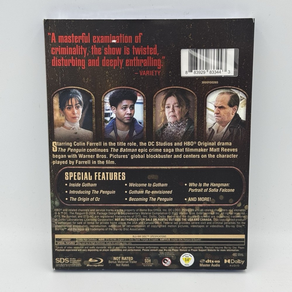 The Penguin Blu-ray Warner Bros. | 2024 | TV Mini-Series | 459 min | Release: Mar 18, 2025 Following the events of The Batman (2022), Oswald Cobblepot, a.k.a. the Penguin, makes a play to seize the reins of the crime world in Gotham. Directors: Craig Zobel , Helen Shaver , Kevin Bray , Jennifer Getzinger Writers: Bill Finger , Bob Kane , Lauren LeFranc , Noelle Valdivia , Nick Towne Starring: Colin Farrell , Cristin Milioti , Rhenzy Feliz , Deirdre O'Connell , Clancy Brown , Carmen Ejogo Video Codec: TBA Resolution: 1080p Original aspect ratio: 2.00:1 Audio English: DTS-HD 5.1 Spanish: Dolby Digital French: Dolby Digital Subtitles English SDH, French, Spanish Discs Blu-ray Disc Three-disc set (3 BD) Playback Blu-ray: Region A United States FREE BOXED SHIPPING from Canada, Bubble Wrapped with extreme care + tracking number. CANADA FREE Bubble Wrapped with extreme care + tracking number. International SHIPPING from Canada, Bubble Wrapped with extreme care + tracking number.