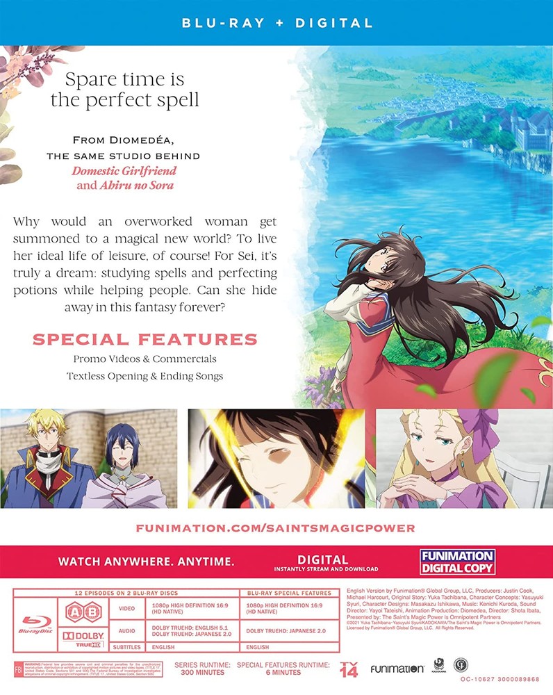 Further Details Title: The Saint's Magic Power is Omnipotent - The Complete Season Condition: New Format: Blu-ray EAN: 0704400106279 Release Date: 05/10/2022 Country/Region of Manufacture: USA Studio: Crunchyroll Subtitle Language: English Director: Various Actor: Various Rating: MPAA Not Rated No Of Discs: 2 Run Time: 5 hours Region Code: Blu-ray: A (Americas, Southeast Asia...) Description: Why would an overworked woman get summoned to a magical new world? To live her ideal life of leisure, of course! For Sei, it's truly a dream: studying spells and perfecting potions while helping people with their problems. Can she hide away in this fantasy forever? Bonus Content: Disc 2 - The Saint's Magic Power Is Omnipotent - The Complete Season: * Promo Videos * Commercials * Textless Opening Song * Textless Closing Song ]]> Release Year: 2022 Missing Information? Please contact us if any details are missing and where possible we will add the information to our listing.