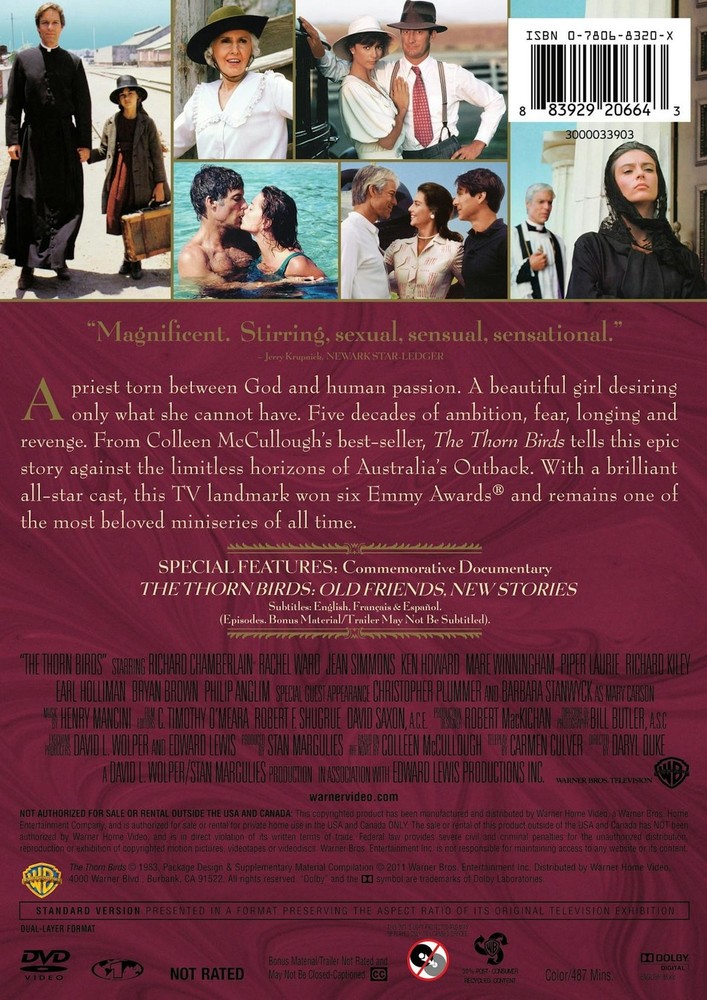 The Thorn Birds The Complete Collection DVD Rachel Ward NEW Product | GRUV Home DVD Blu-ray 4K Gruv > The Thorn Birds The Complete Collection DVD Rachel Ward NEW [Back] The Thorn Birds The Complete Collection DVD Rachel Ward NEW Winner of six Emmy® awards, four Golden Globe awards and countless nominations, The Thorn Birds is the second-highest-rated miniseries ever … and it’s easy to see why. Featuring an all-star and award-winning cast — including Richard Chamberlain, Rachel Ward, Barbara Stanwyck, Bryan Brown, Jean Simmons, Barry Corbin, Mare Winningham, Piper Laurie, Christopher Plummer and more — this epic drama set against the sweeping backdrop of the Australian outback tells of the taboo romance between a beautiful woman, Meggie, and an ambitious priest, Ralph de Bricassart, whose dedication to the church is greater than his desire for young Meggie — but barely. Spanning five decades, from a ranch in Australia to the Vatican in Rome and back, this seductive saga is based on Colleen McCullough’s bestselling novel about an unattainable and forbidden love. Re-live the drama and romance or see it for the first time right here … right now. Product The Thorn Birds: The Complete Collection (Box Set) [DVD] Based on: The novel by Colleen McCollough Format: DVD Catalogue No: 1000226761 Studio: Warner Certification: NR Release Date: 06/28/11 Region: Region 1 Duration: 456 minutes Discs: 3 Color: Color Sound: MONO - English Extras: Language(s): English|Interactive Menu Shipping *** FREE SHIPPING ON ALL ORDERS *** All items ordered before 11:00am EST will be shipped on the same day. Items ordered after 11:00am EST will be shipped on the following day. Orders placed after 11:00am EST on Friday will be shipped on the following Monday. If you have any questions regarding your order, please contact us How will I know when my order has been shipped? As soon as your order is sent from our warehouse you will be sent an email to confirm that it's on its way. Once my order has been shipped when will I receive it? Depending on your method of shipping, your timing will vary: Economy Shipping - you will receive your order in 3-10 days Expedited Shipping - you will receive your order in 1-5 days Next Business Day - you will receive your order in 1 Business day. This service is only available on orders placed Monday through Thursday The timeliness of service to destinations outside the contiguous U.S. may be affected by the limited availability of transportation. Due to the variability of transportation, Package Services and USPS Mail packages may take up to two to five weeks to reach Hawaii, Alaska, Puerto Rico and any U.S. Territories. This includes ZIP Codes with prefixes of 967 and 969 and those with the following prefixes: 995, 996, 997, 998, 999, 968, 006, 007, 008, and 009 Do you charge for shipping? *** FREE SHIPPING ON ALL ORDERS *** Economy Shipping - USPS Media Mail - FREE - 3 to 10 business days Expedited Shipping - FedEx Ground - $5.99 - 1 to 5 business days Next Business Day - FedEx Overnight - $14.99 - 1 business day PLEASE NOTE THAT ORDERS PLACED USING FEDEX CANNOT BE DELIVERED TO PO BOXES What do I do if I have not received my order? If your order does not arrive within 14 days please contact us so that we can investigate with the delivery company. One of the items is missing from my order. What do I do? Sometimes items that are purchased on the same order may arrive to you on different days. We will send you an email to let you know when each item is on its way. What happens if I am not at home to accept my delivery? Most of our products do not require you to be at home to be delivered. In the event that you have ordered products which will not fit in your mailbox, and you are not home to accept the delivery, then the postal service will follow their usual procedure. This usually means a card is left to notify you of an attempted delivery and the item will be held at your local sorting office. For items sent via FedEx, a card should also be left to allow you to arrange a redelivery or collection. Which countries do you deliver to? We deliver to the United States and US territories. Do you deliver on Public Holidays? Holidays are not considered working days, so we don't include these in our estimated delivery times. In this instance you should expect delivery on the next working day following the Holiday. Returns Here at GRUV Entertainment we want you to be 100% happy with your purchase, and we'll do everything we can to make sure you are. If you would like to return a product to us, please contact us. How do I return an item? To arrange a return please contact us and we will be more than happy to arrange this for you. All you need to tell us is which items you wish to return and the reason why. We will then issue you a unique Returns Authorization (RA) number and the return instructions. I have received my item, but I no longer want to keep it? If you are unhappy with your purchase, please contact us within 30 days of receiving the item for a full refund - please note that DVDs, Blu-rays & 4K Ultra HD that have been opened or have had their shrink-wrap removed are not eligible for return. The cost of shipping to return a product you no longer require will be paid for by the person returning the product and will require a Returns Authorization (RA) number. The RA number will be given to you by our customer services team. I have received my item but it's damaged / faulty. What should I do? If your item arrived damaged or is faulty, we will make this right as soon as possible, either by sending a replacement item to you or refunding your account. If we ask for the item to be returned to us, then GRUV Entertainment will pay for the cost of the return via a pre-paid label. In the unlikely event that your order is received damaged or faulty, all you need to do is contact us within 30 days of receiving the item and we will provide you with the relevant returns information. I have r