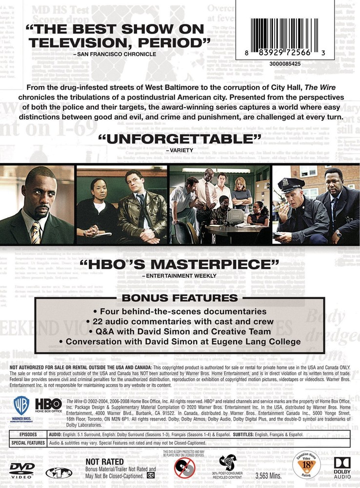 The Wire The Complete Series DVD Dominic West NEW Product | GRUV Home DVD Blu-ray 4K Gruv > The Wire The Complete Series DVD Dominic West NEW [Back] The Wire The Complete Series DVD Dominic West NEW From the drug-infested streets of West Baltimore to the corruption of City Hall, The Wire chronicles the tribulations of a post-industrial American city. Viewed from the perspectives of both the police and their targets, the award-winning series captures a world where easy distinctions between good and evil, and crime and punishment, are challenged at every turn. Product The Wire: The Complete Series (Box Set) [DVD] Format: DVD Catalogue No: 1000780688 Studio: HBO Certification: TV-14 Release Date: 12/01/20 Region: Region 1 Duration: 3563 minutes Discs: 23 Color: Color Extras: Language(s): English|Interactive Menu Shipping *** FREE SHIPPING ON ALL ORDERS *** All items ordered before 11:00am EST will be shipped on the same day. Items ordered after 11:00am EST will be shipped on the following day. Orders placed after 11:00am EST on Friday will be shipped on the following Monday. If you have any questions regarding your order, please contact us How will I know when my order has been shipped? As soon as your order is sent from our warehouse you will be sent an email to confirm that it's on its way. Once my order has been shipped when will I receive it? Depending on your method of shipping, your timing will vary: Economy Shipping - you will receive your order in 3-10 days Expedited Shipping - you will receive your order in 1-5 days Next Business Day - you will receive your order in 1 Business day. This service is only available on orders placed Monday through Thursday The timeliness of service to destinations outside the contiguous U.S. may be affected by the limited availability of transportation. Due to the variability of transportation, Package Services and USPS Mail packages may take up to two to five weeks to reach Hawaii, Alaska, Puerto Rico and any U.S. Territories. This includes ZIP Codes with prefixes of 967 and 969 and those with the following prefixes: 995, 996, 997, 998, 999, 968, 006, 007, 008, and 009 Do you charge for shipping? *** FREE SHIPPING ON ALL ORDERS *** Economy Shipping - USPS Media Mail - FREE - 3 to 10 business days Expedited Shipping - FedEx Ground - $5.99 - 1 to 5 business days Next Business Day - FedEx Overnight - $14.99 - 1 business day PLEASE NOTE THAT ORDERS PLACED USING FEDEX CANNOT BE DELIVERED TO PO BOXES What do I do if I have not received my order? If your order does not arrive within 14 days please contact us so that we can investigate with the delivery company. One of the items is missing from my order. What do I do? Sometimes items that are purchased on the same order may arrive to you on different days. We will send you an email to let you know when each item is on its way. What happens if I am not at home to accept my delivery? Most of our products do not require you to be at home to be delivered. In the event that you have ordered products which will not fit in your mailbox, and you are not home to accept the delivery, then the postal service will follow their usual procedure. This usually means a card is left to notify you of an attempted delivery and the item will be held at your local sorting office. For items sent via FedEx, a card should also be left to allow you to arrange a redelivery or collection. Which countries do you deliver to? We deliver to the United States and US territories. Do you deliver on Public Holidays? Holidays are not considered working days, so we don't include these in our estimated delivery times. In this instance you should expect delivery on the next working day following the Holiday. Returns Here at GRUV Entertainment we want you to be 100% happy with your purchase, and we'll do everything we can to make sure you are. If you would like to return a product to us, please contact us. How do I return an item? To arrange a return please contact us and we will be more than happy to arrange this for you. All you need to tell us is which items you wish to return and the reason why. We will then issue you a unique Returns Authorization (RA) number and the return instructions. I have received my item, but I no longer want to keep it? If you are unhappy with your purchase, please contact us within 30 days of receiving the item for a full refund - please note that DVDs, Blu-rays & 4K Ultra HD that have been opened or have had their shrink-wrap removed are not eligible for return. The cost of shipping to return a product you no longer require will be paid for by the person returning the product and will require a Returns Authorization (RA) number. The RA number will be given to you by our customer services team. I have received my item but it's damaged / faulty. What should I do? If your item arrived damaged or is faulty, we will make this right as soon as possible, either by sending a replacement item to you or refunding your account. If we ask for the item to be returned to us, then GRUV Entertainment will pay for the cost of the return via a pre-paid label. In the unlikely event that your order is received damaged or faulty, all you need to do is contact us within 30 days of receiving the item and we will provide you with the relevant returns information. I have received an item that I did not order. What should I do? If you received an item that you did not order, you can return it to us within 30 days of receiving it for a full refund or replacement. If we ask for the item to be returned to us, then GRUV Entertainment will pay for the cost of the return via a pre-paid label. When will I receive my refund/replacement? We will process your refund / replacement as soon as your item is received back into our warehouse. Replacements are subject to availability and, if not available, a refund will be given instead. Where possible please retain the packaging that your original order arrives in as you can use it to return the items to us.