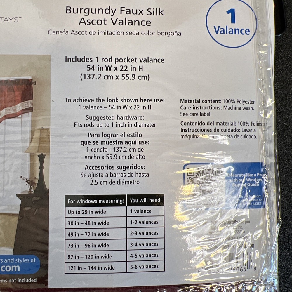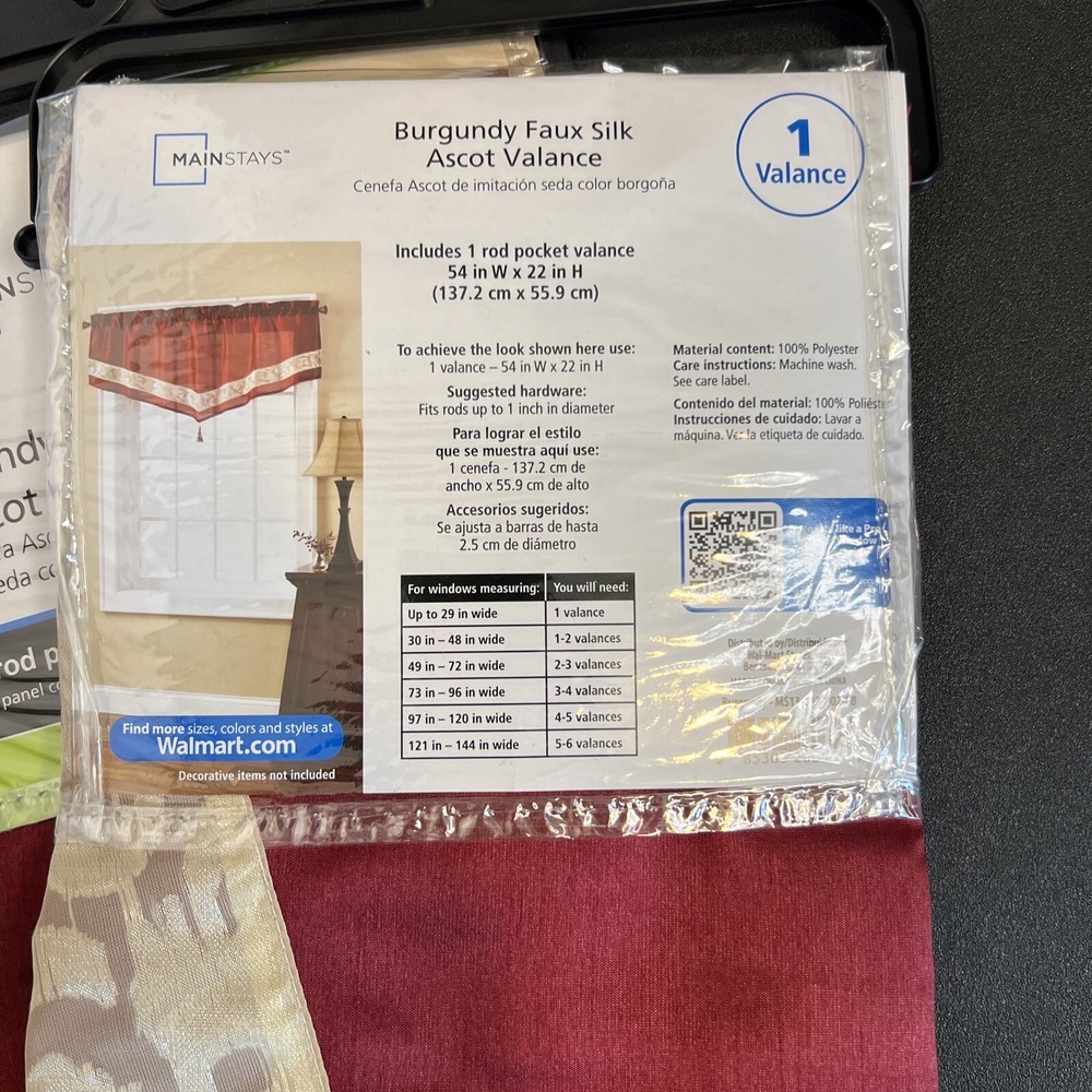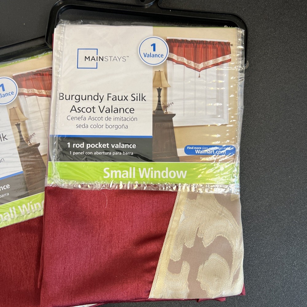 Enhance the beauty of your home with this set of three Mainstays burgundy faux silk ascot valances. The rich red color and solid pattern add a classic touch to any room. Made from high-quality faux silk material, these valances are durable and easy to care for with machine wash instructions. Measuring 54 inches in length and 22 inches in width, they are perfect for wall-mounted curtains with rod pockets. These valances are ideal for both indoor use and any time period manufactured. Made in China, they are a great addition to your home goods collection.