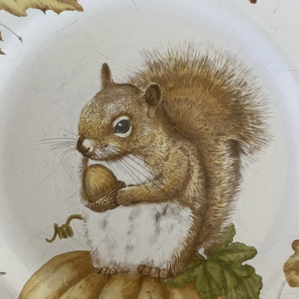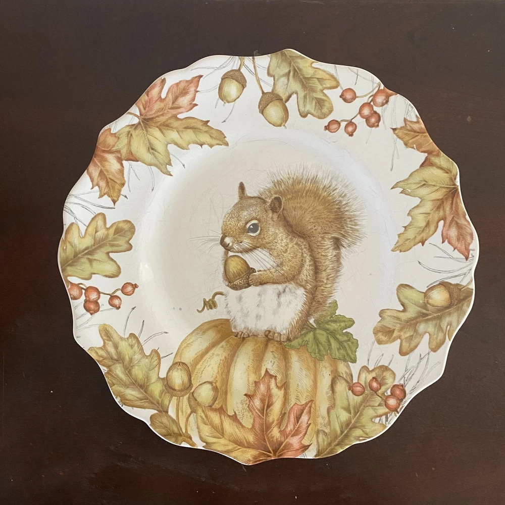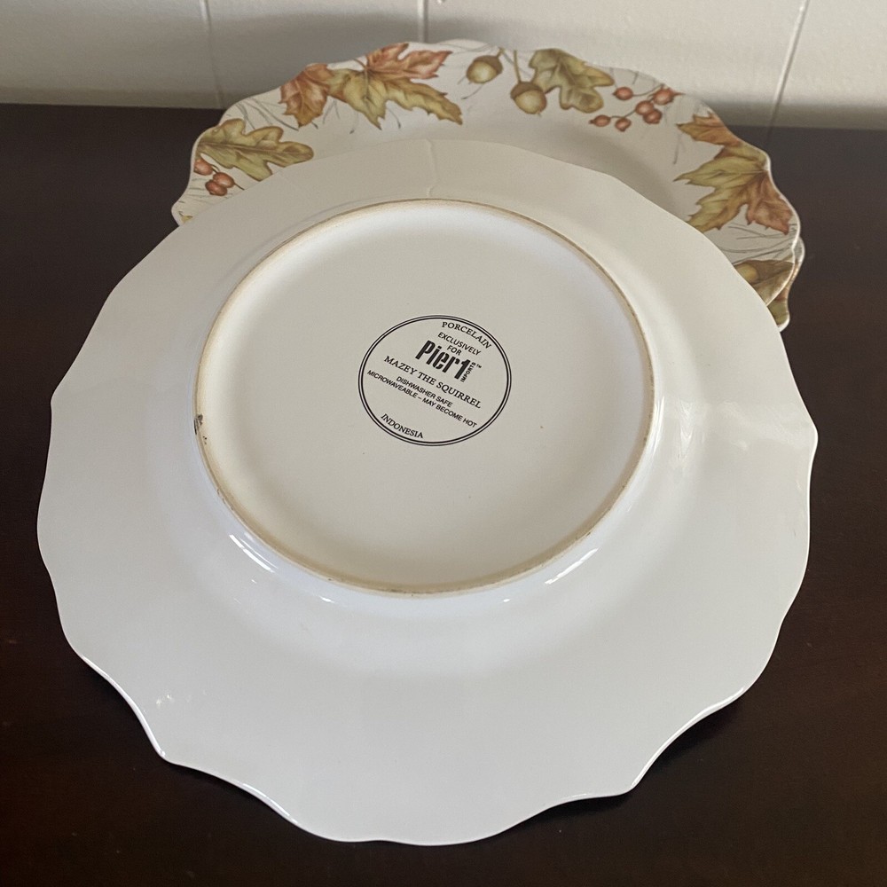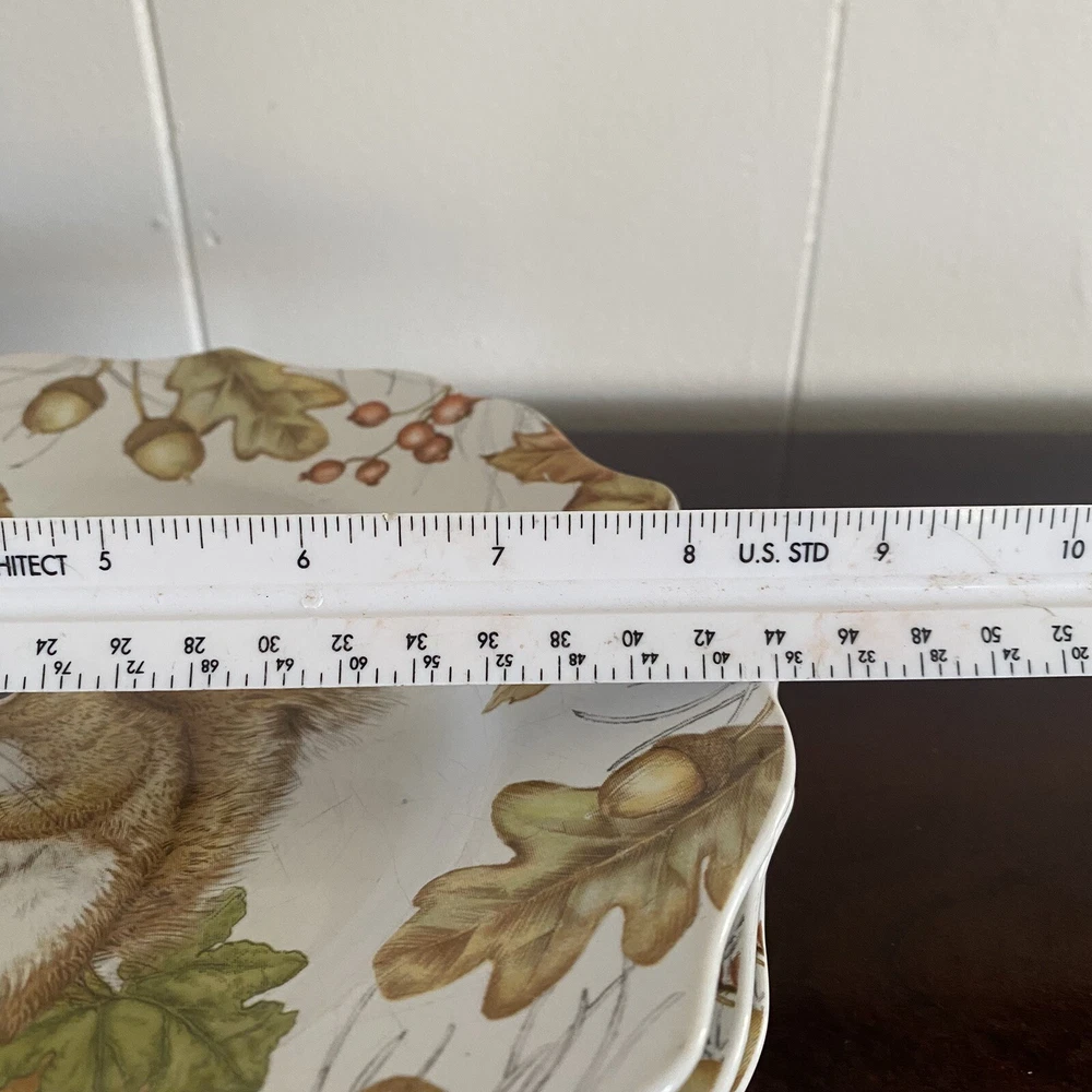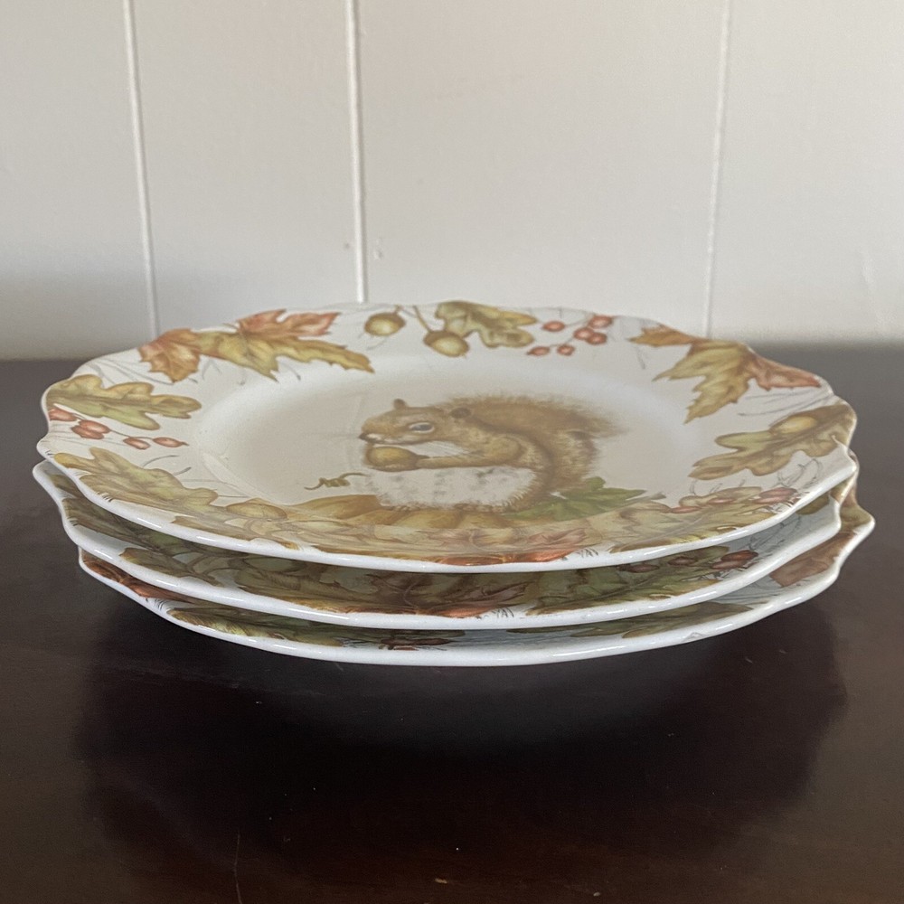 Three (3) Pier 1 Mazey the Squirrel Collection 8.5” Salad Plates Utensil Marks. There are no chips or cracks. There ARE utensil marks. PLEASE see all photos for condition.