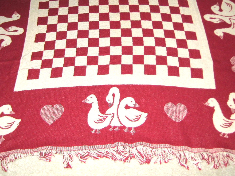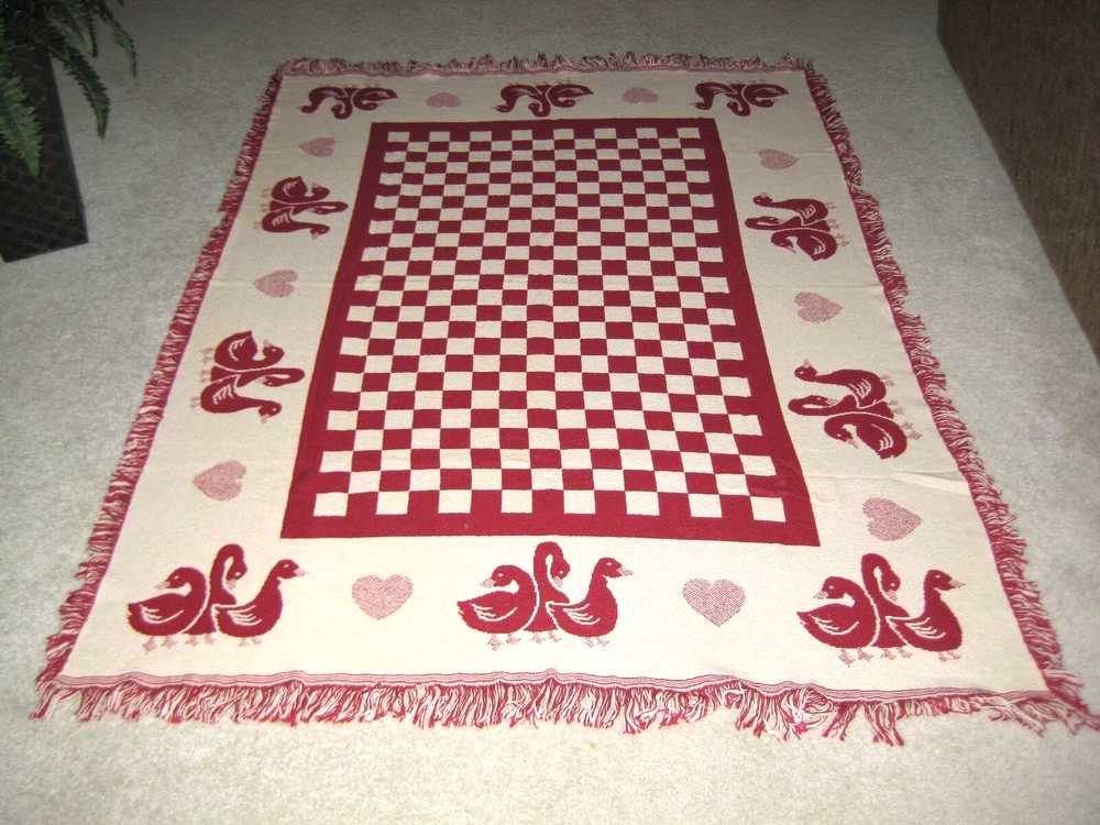 Hearts, Ducks & Swans Throw Blanket - Preowned Approximately 68" X 48" not including the fringe and weighs about 1 1/2 lbs. There are no Labels on this Blanket. Blanket has been stored in a Cedar Ches...