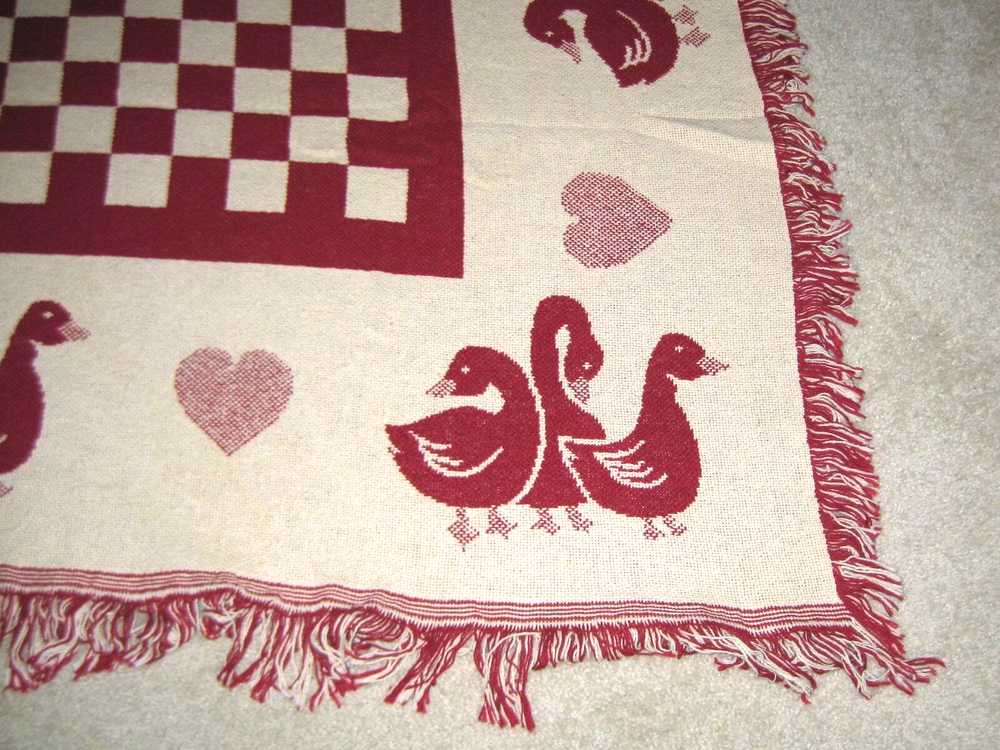 Hearts, Ducks & Swans Throw Blanket - Preowned Approximately 68" X 48" not including the fringe and weighs about 1 1/2 lbs. There are no Labels on this Blanket. Blanket has been stored in a Cedar Chest in a smoke free environment.
