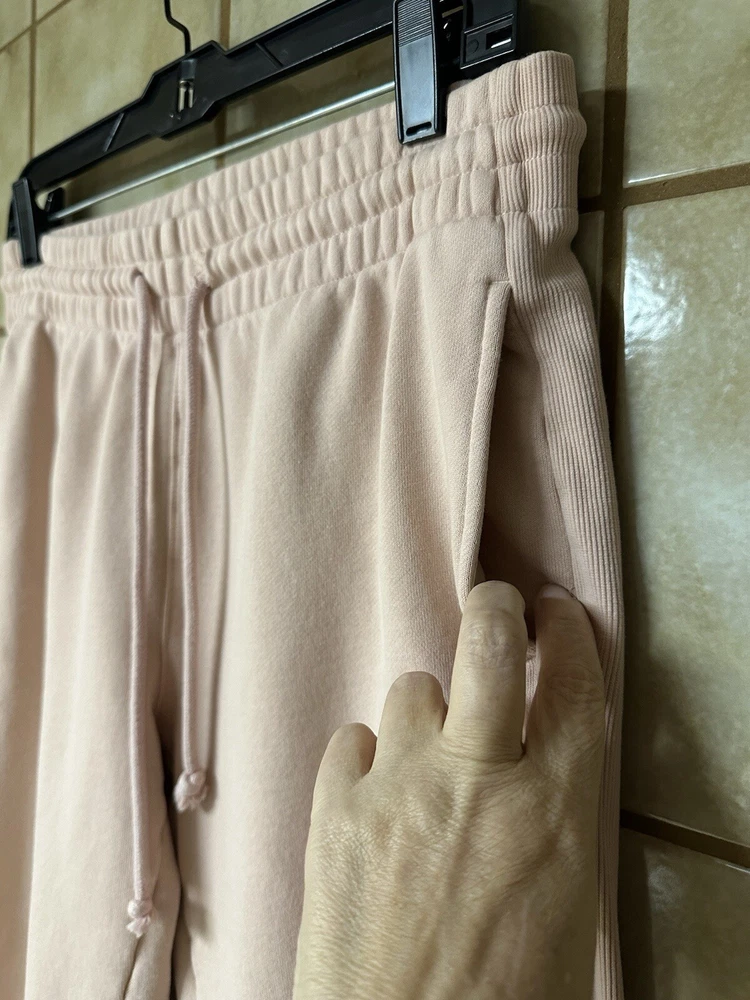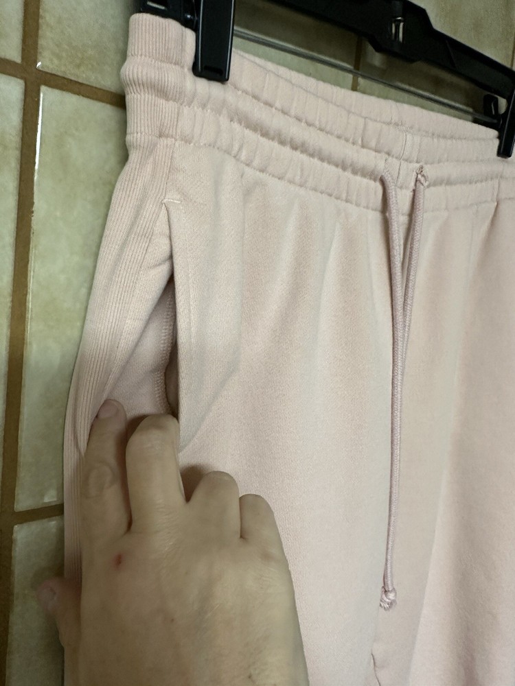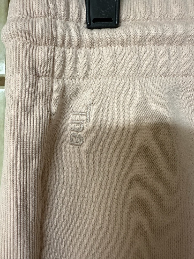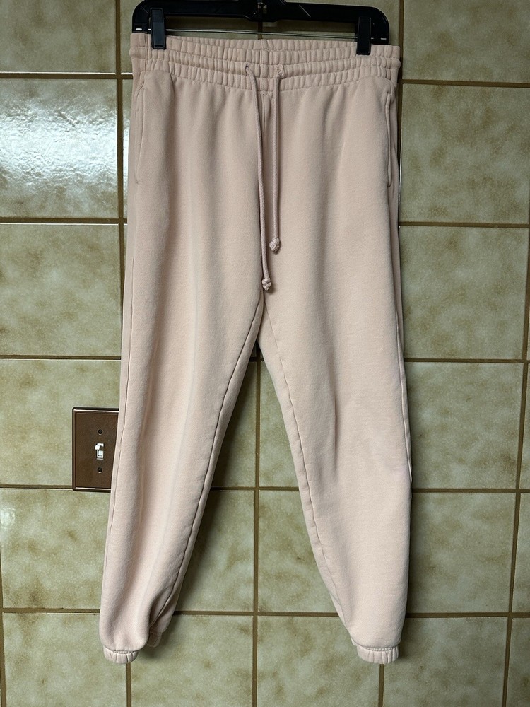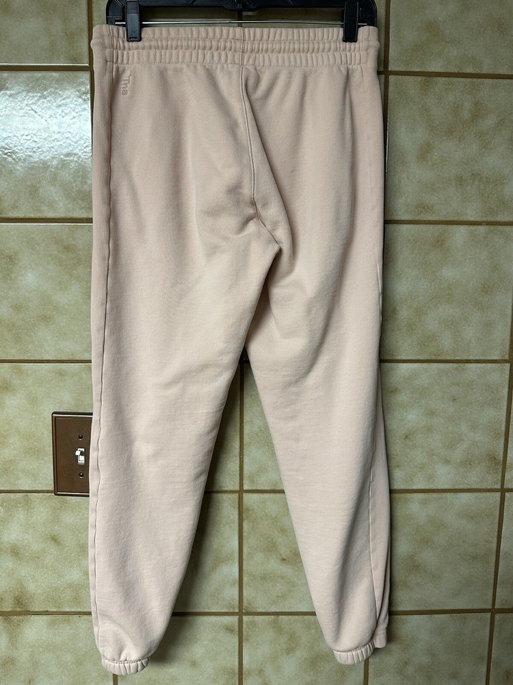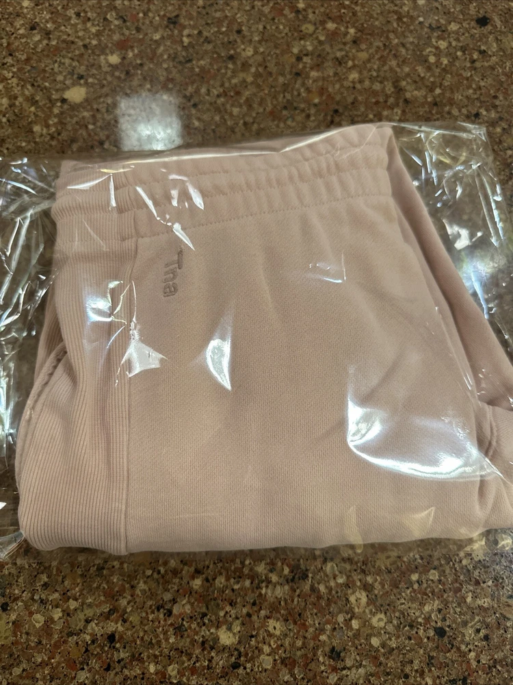 Tna Cozy AF Fleece Joggers in a neutral pink color and size small. The drawstring closure and elastic waist provide comfort while the cotton blend material and fleece fabric type keep you warm and cozy. They feature pockets, easy care, and breathable fabric, making them ideal for everyday wear. The jogger style and regular fit ensure a flattering look while the 27" inseam and waist size of 30" fit women's size S. Made in Sri Lanka, these pants are a great addition to any activewear collection. See pics of flaw at drawstring and snag near logo.
