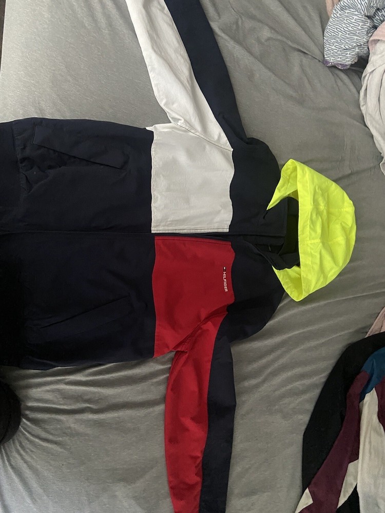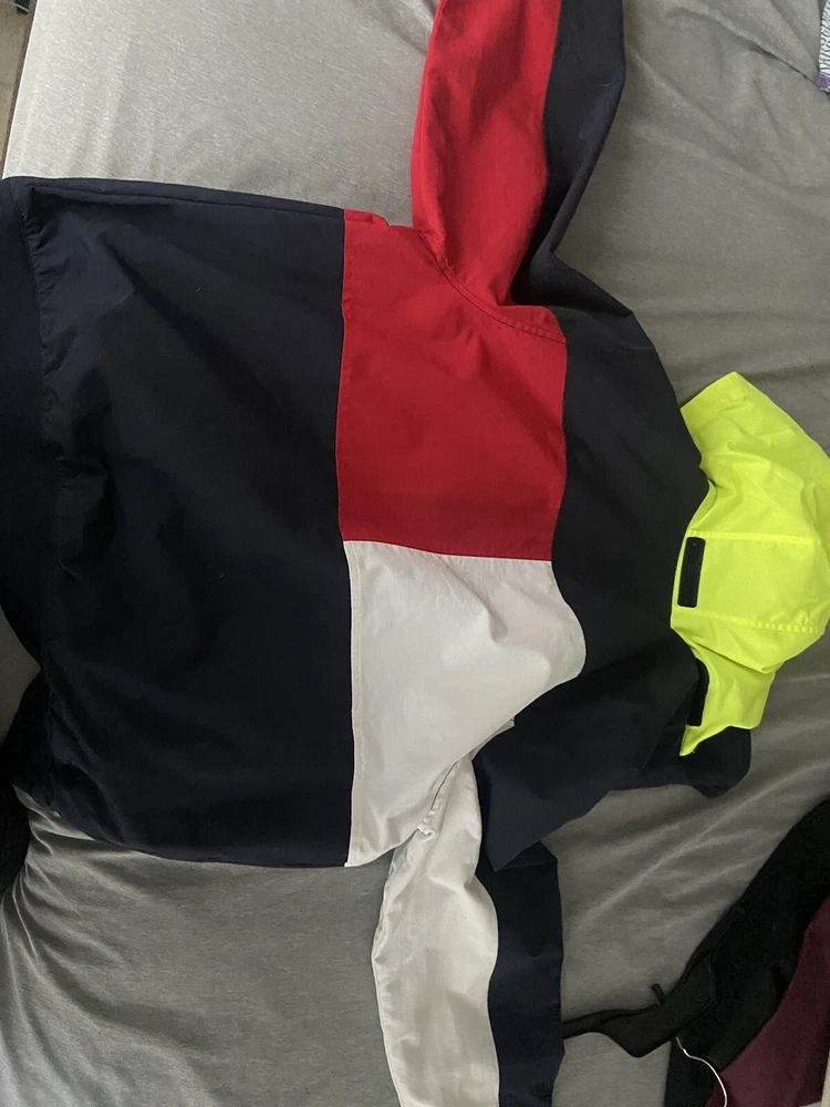 This Tommy Hilfiger jacket is a must-have for any fashion-conscious man. With a big flag logo on the front, this jacket is perfect for adding a vintage style touch to your wardrobe. Made from lightweight, waterproof material, it's ideal for all seasons, and is wind-resistant to keep you warm and dry in any weather. Featuring a hood to keep your head dry, this jacket is perfect for outdoor activities, while the logo accents add a touch of style. Whether worn for practicality or fashion, this jacket is a great addition to any wardrobe.