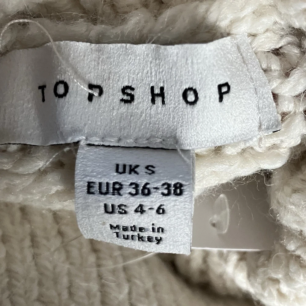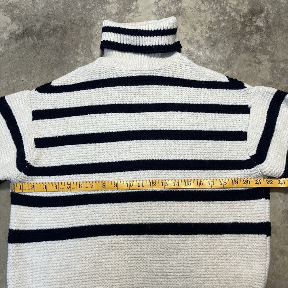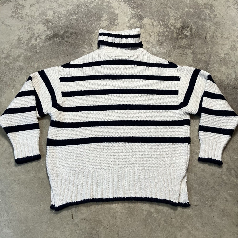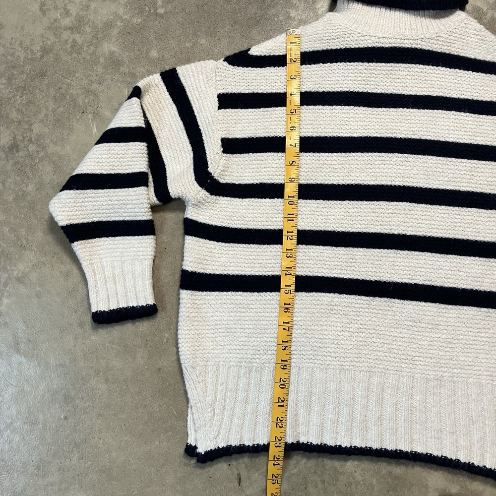 Elevate your wardrobe with this designer Topshop sweater. The classic black and white striped pattern, combined with the tight-knit fabric, makes for a stunning piece that is perfect for any occasion, whether it be travel, casual outings, or workwear. The long sleeves and turtleneck neckline provide extra warmth during the chilly winter, fall, or spring seasons. This sweater is machine washable and made of a stretchy, oversized fit that is comfortable and flattering for any body type. It is a regular fit, size 4, and is made of a polyester and acrylic blend material. The knit style is an excellent choice for those looking for a cozy and fashionable sweater. Has a small pull near sleeve