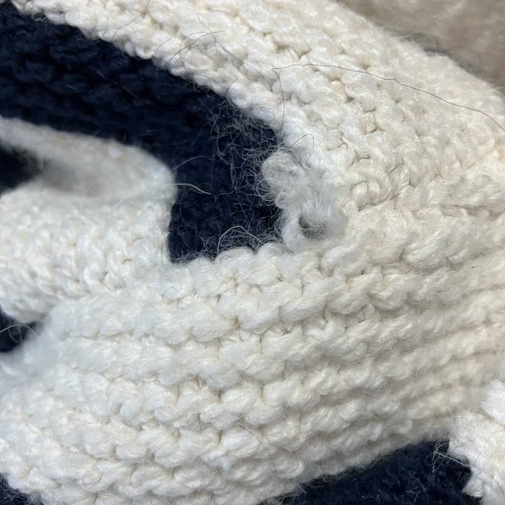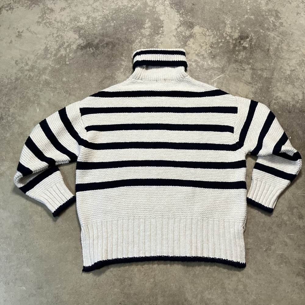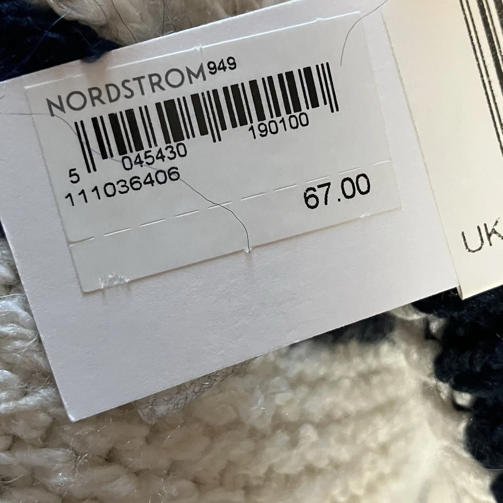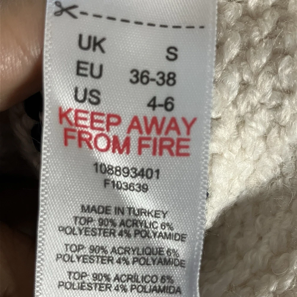 Elevate your wardrobe with this designer Topshop sweater. The classic black and white striped pattern, combined with the tight-knit fabric, makes for a stunning piece that is perfect for any occasion, whether it be travel, casual outings, or workwear. The long sleeves and turtleneck neckline provide extra warmth during the chilly winter, fall, or spring seasons. This sweater is machine washable and made of a stretchy, oversized fit that is comfortable and flattering for any body type. It is a regular fit, size 4, and is made of a polyester and acrylic blend material. The knit style is an excellent choice for those looking for a cozy and fashionable sweater. Has a small pull near sleeve