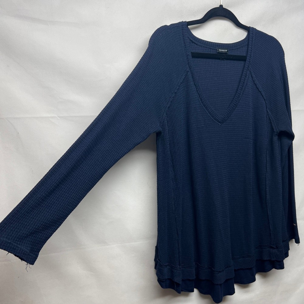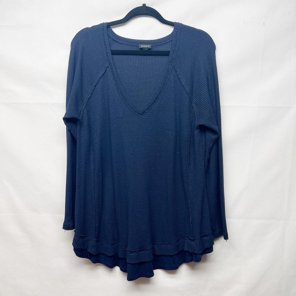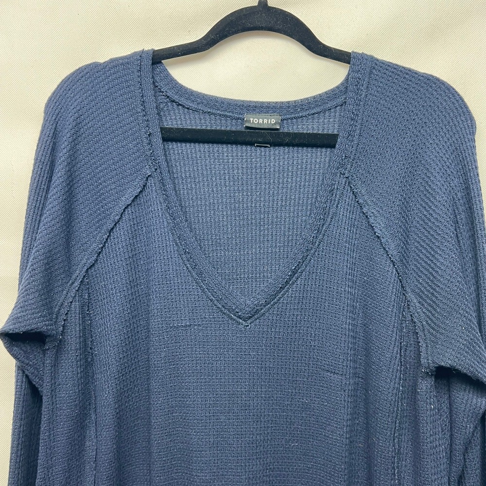 <![CDATA[<div>Torrid women's thermal pullover in navy blue. V-neck. Long raglan sleeves. Round hem. Exposed seams. Waffle knit. Stretch. In good used condition. No stains, tears or holes. Polyester, rayon, spandex blend. Machine wash. fall winter casual sleep lounge comfort cozy relaxed
