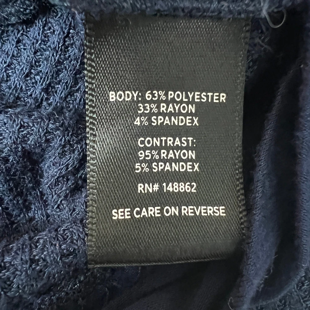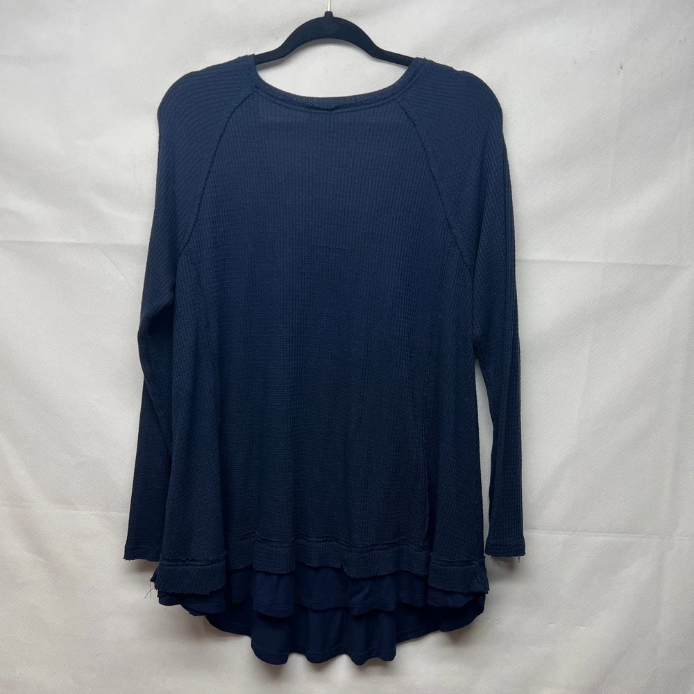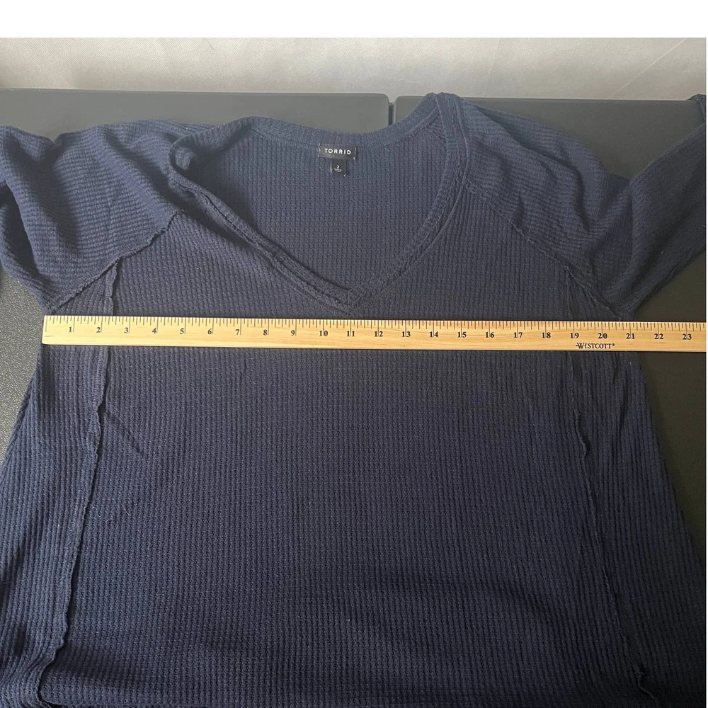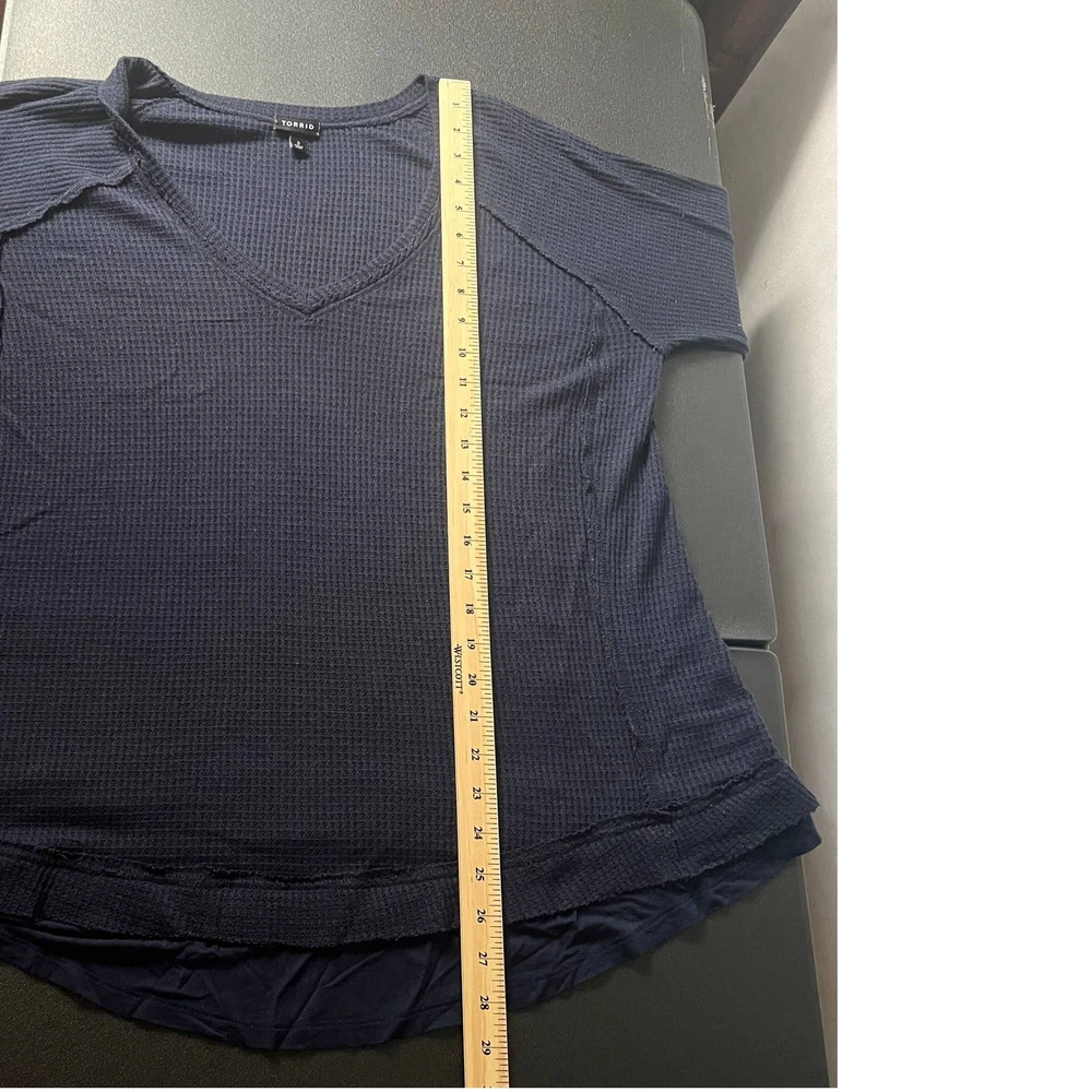 <![CDATA[<div>Torrid women's thermal pullover in navy blue. V-neck. Long raglan sleeves. Round hem. Exposed seams. Waffle knit. Stretch. In good used condition. No stains, tears or holes. Polyester, rayon, spandex blend. Machine wash. fall winter casual sleep lounge comfort cozy relaxed