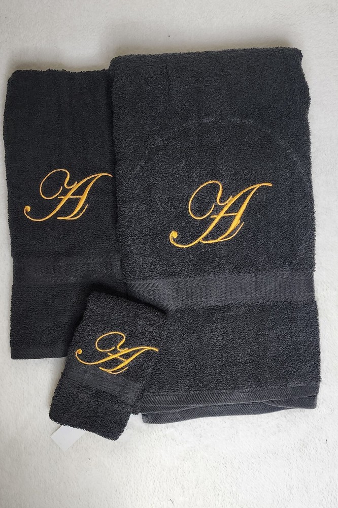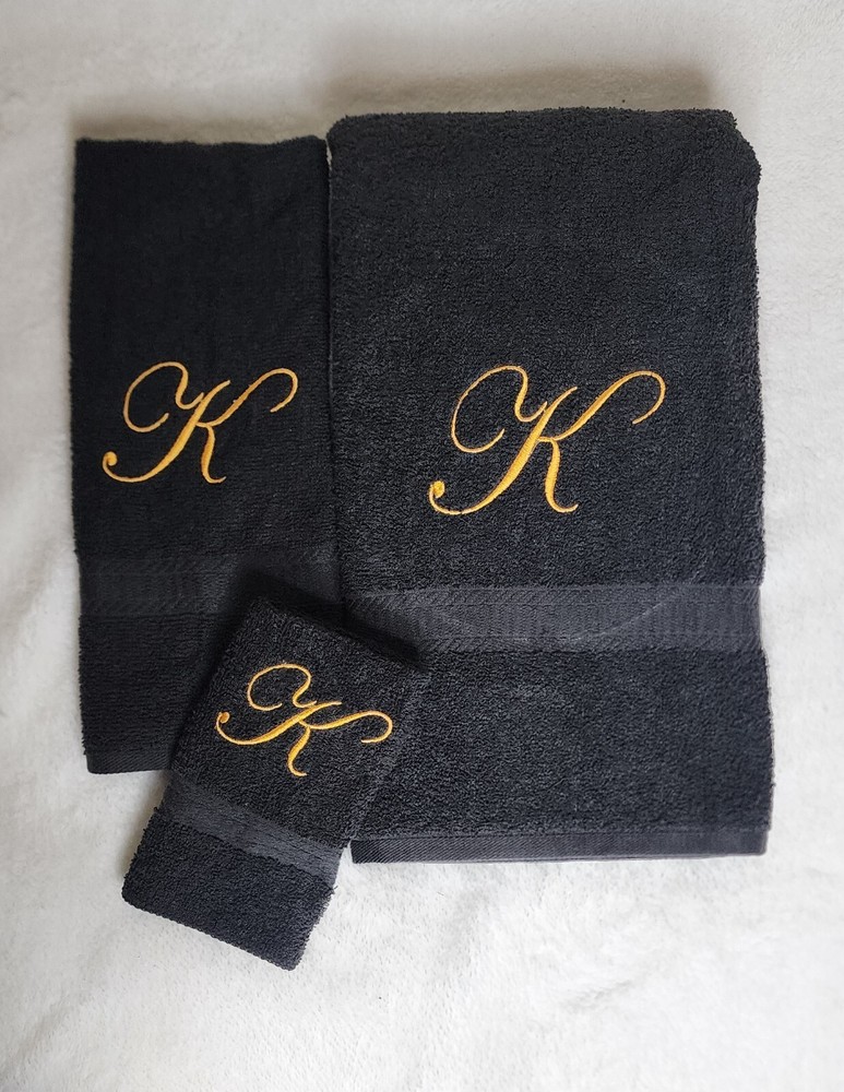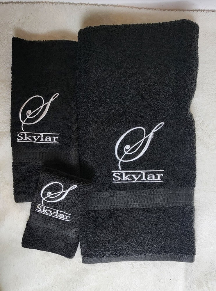 Personalized 3 piece towel set: bath(27x52} hand(16x26 towel and washcloth(12x12) combo set. All items are custom made. I have a range off designs just ask...sports, mascots, cartoons, sayings and many more. Please specify color of towels white, black, grey, blue. These towels will be personalized at your request for FREE! Simply include your request in the comment box or send us a separate message with details. Smoke and pet free environment. COLOR AND TOWEL DESIGN MAY VARY DO TO AVAILABLITY! Thank you for viewing our listings and be sure to check back. We are constantly adding new items. So add us to your favorite sellers list and visit often. Thanks