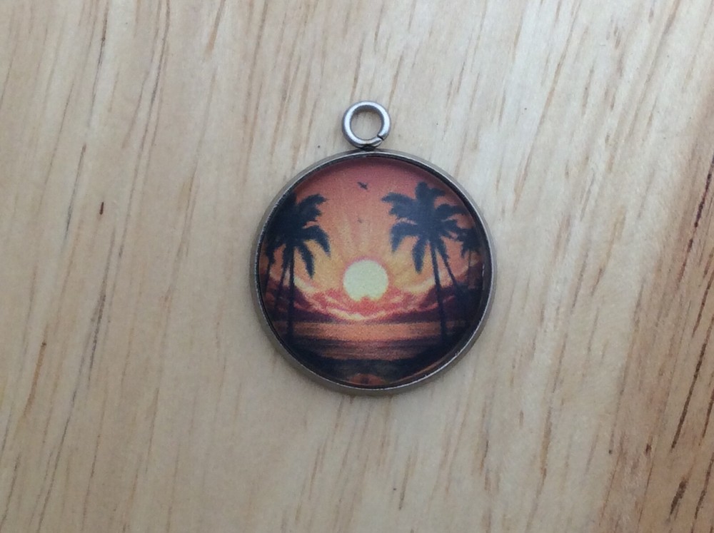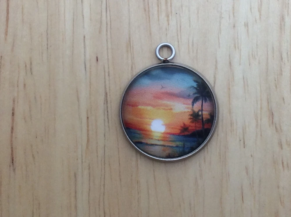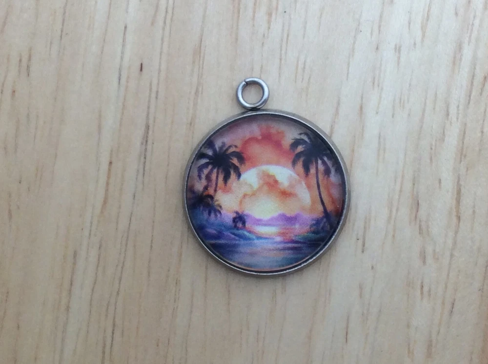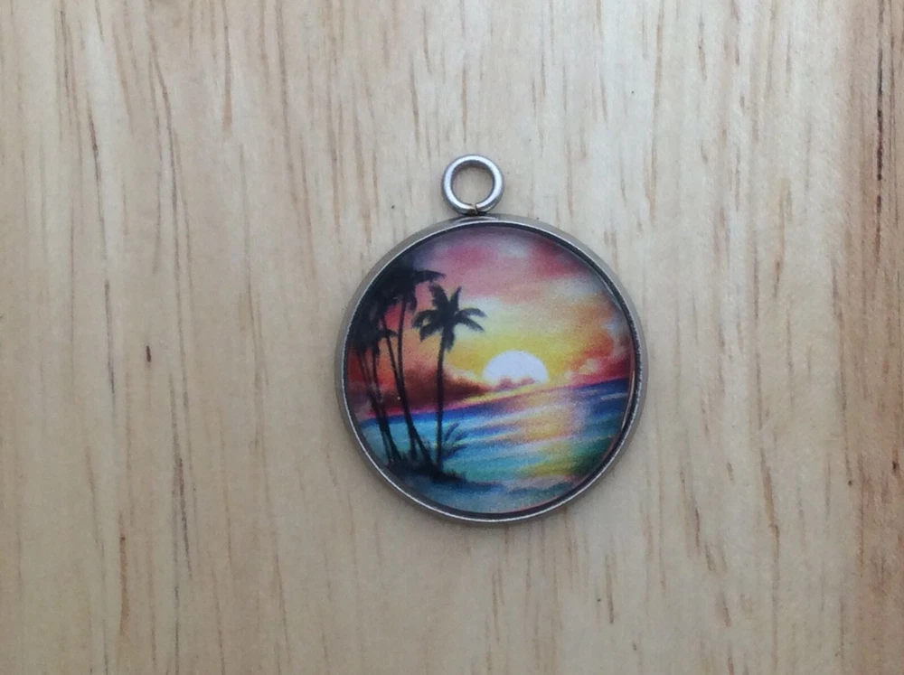 At I Like Worms, We make our Tropical Sunset charms with glass cabochons and they are set in a stainless steel base. We make these Charms and pendants in three different sizes. * Small (14mm) -good size for Earrings * Medium (18mm) - good size for Bracelets * Large ( 25mm) - good size for Necklaces " CLICK ON THE STYLE# TO SEE THE CORRESPONDING IMAGE" These wonderful Photo Glass cabochon charms and pendants are great for making Necklaces, Bracelets, Earrings, Bookmarks, Zipper pulls, Hat Pins, Lapel Pins, Magnets, Key Tags, Purse Danglers, DIY Crafts and so much more... The possibilities are endless with these charms so let your creativity run wild!