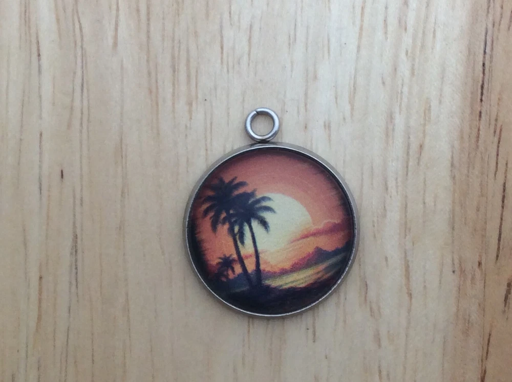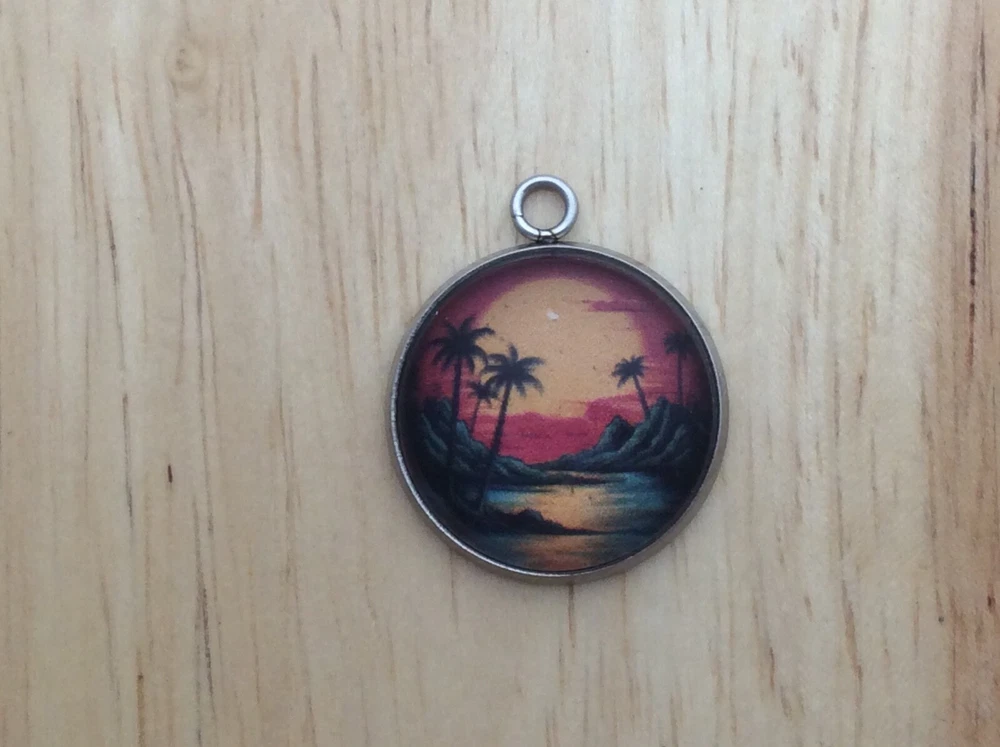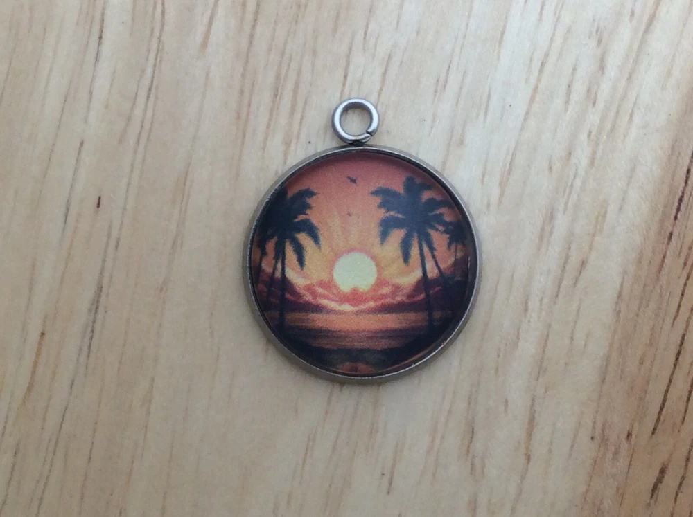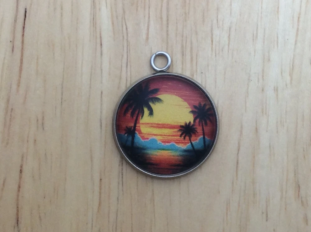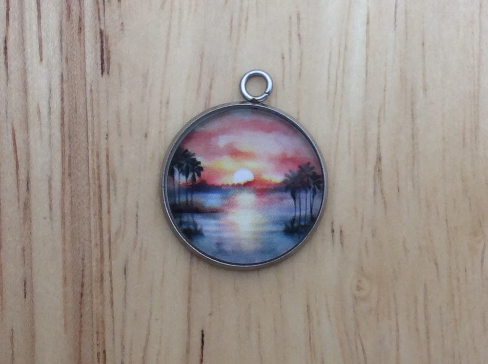At I Like Worms, We make our Tropical Sunset charms with glass cabochons and they are set in a stainless steel base. We make these Charms and pendants in three different sizes. * Small (14mm) -good size for Earrings * Medium (18mm) - good size for Bracelets * Large ( 25mm) - good size for Necklaces " CLICK ON THE STYLE# TO SEE THE CORRESPONDING IMAGE" These wonderful Photo Glass cabochon charms and pendants are great for making Necklaces, Bracelets, Earrings, Bookmarks, Zipper pulls, Hat Pins, Lapel Pins, Magnets, Key Tags, Purse Danglers, DIY Crafts and so much more... The possibilities are endless with these charms so let your creativity run wild!