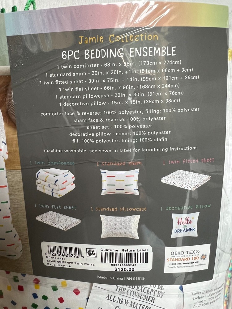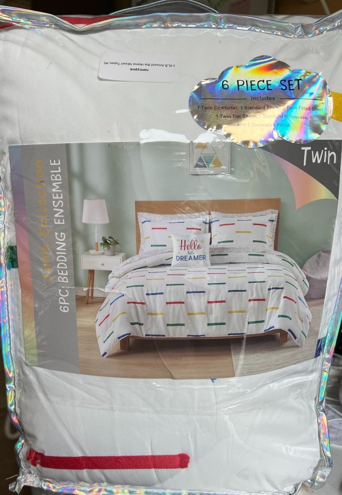 Transform your bedroom into a cozy haven with this Jamie Comfort Twin White 6PC Bedding Ensemble. The set includes a decorative pillow, pillow sham, comforter, pillowcase, fitted sheet, and flat sheet, all made from soft and durable polyester material. The white color and Jamie character adds a touch of charm to your space, perfect for a relaxing evening in. This comforter set is ideal for any bedroom, and is sure to keep you comfortable and stylish all night long. NEW in bag - Original price $120