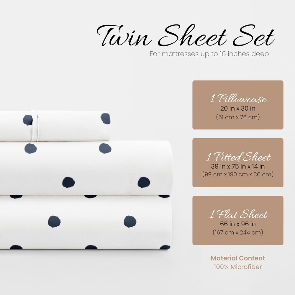 USA Deals Direct USA Deals Direct › Sheets › Twin Soft Dots Navy Microfiber Sheet Set Luxurious Comfort Durable Bedding Twin Soft Dots Navy Microfiber Sheet Set Luxurious Comfort Durable Bedding Buy Now LUXURIOUS SLEEP: Get ready to sleep in cloud-like comfort every night with your new luxurious twin sheets. Softer than cotton sheets, cozy and comfortable, they're the perfect way to treat yourself to a sound sleep. WHAT MAKES OUR SHEETS DIFFERENT: Most bed sheet fabrics are only brushed once to soften them up, but to make sure you get the best night’s sleep, we brush our fabric TWICE. Tuck yourself into these cloud-like sheets and soundly drift off to sleep every night. EASY SHEET CHANGES: Changing sheets on deep beds is frustrating, but not with our 16” deep pocket sheets. Our snug-fit design allows for you to easily put your fitted sheets on without the hassle of wrestling down every corner. This set includes a fitted and flat sheet, and one pillowcase. CONFIDENTLY DURABLE: Pets, kids, and family life can take a hard toll on sheets and other bedding, but our microfiber twin size sheets are made to last. Expert stitching and seams ensure that your durable twin sheet set stands up to wear and tear for years to come. BEAUTIFUL BED SHEETS: Our unique Soft Dots print is sure to add a touch of elegance and brighten up your bedroom. Check all 13 of our popular color options in all 5 size options to find the perfect match for every bedroom in your home. This pattern sheet set by Linen Market is the most luxurious bedding on the market at the most affordable price. The unparalleled softness and the excellent breathability keep you dry and cool throughout the night is sure to impress you. Your comfort is of the utmost importance to us. In addition to impeccable comfort, our sheets are wrinkle resistant, twice as strong as cotton, and perfect for all seasons. Shipping We offer FREE fast shipping on all orders! Most items will be packaged within 1 or 2 days. We ship every day including Saturday and Sunday. Returns We accept returns within 30 days of receipt of the item. Contact us Customer satisfaction is very important to us. If you have any problems with your order please message us first and we will do our best to make you satisfied! We usually respond within 24-48 hours. Please visit our eBay store for other Sheets items for sale. Thank you for shopping in our store!