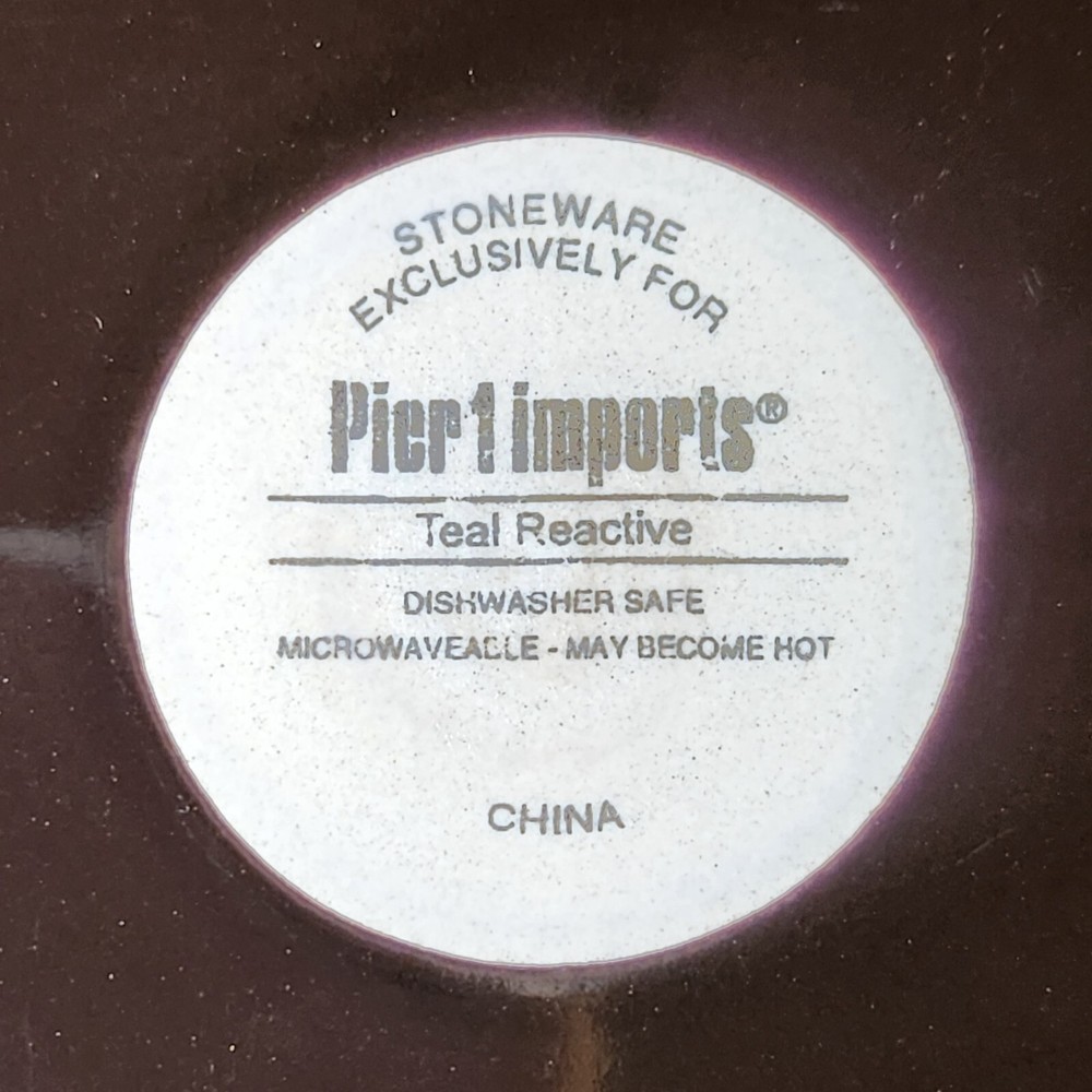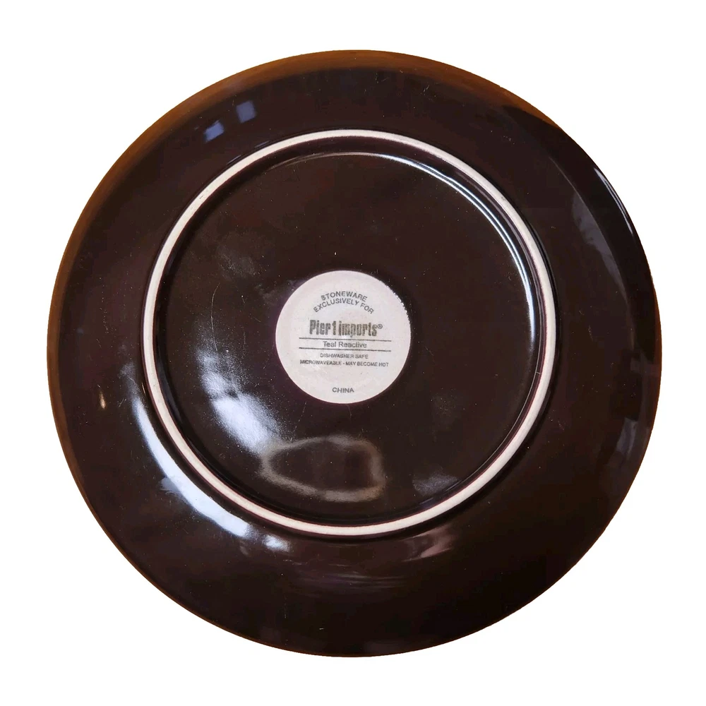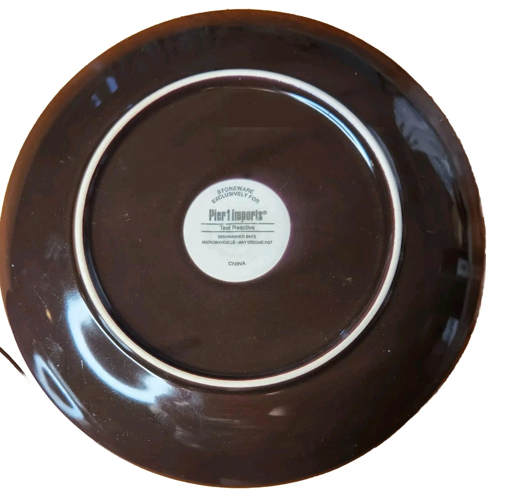 Add a touch of modern elegance to your dining table with these two stoneware salad snack plates from Pier 1 Imports. The plates feature a beautiful teal reactive pattern with an abstract peacock feather design, perfect for all occasions. Measuring 8.25 inches in diameter and 1 inch in height, these round plates are dishwasher safe and made of stoneware. The set includes two plates and is an original production style from China. The backstamp is printed, and the product line is Pier1 Imports. Perfect for any adult, these plates are a must-have addition to your collection. Great Pre-owned condition Ships USPS Priority or Ground Advantage Mail or FedEx Home Delivery.